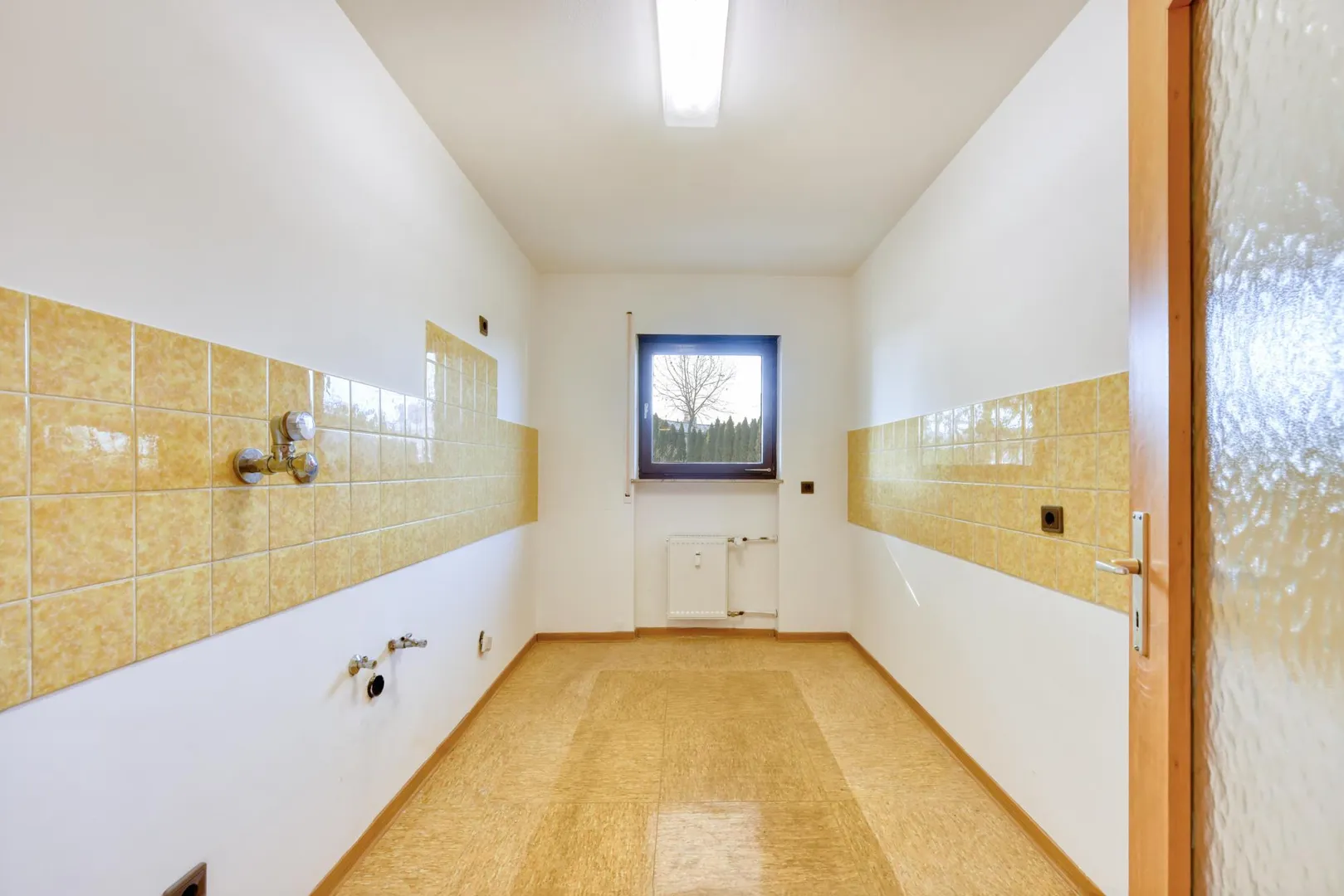 Die Küche wird in den nächsten Tagen modernisiert. Der Fliesen-Wand-Spiegel entfällt. Der Boden wird gefliest. Eine Einbauküche ist Mietersache.