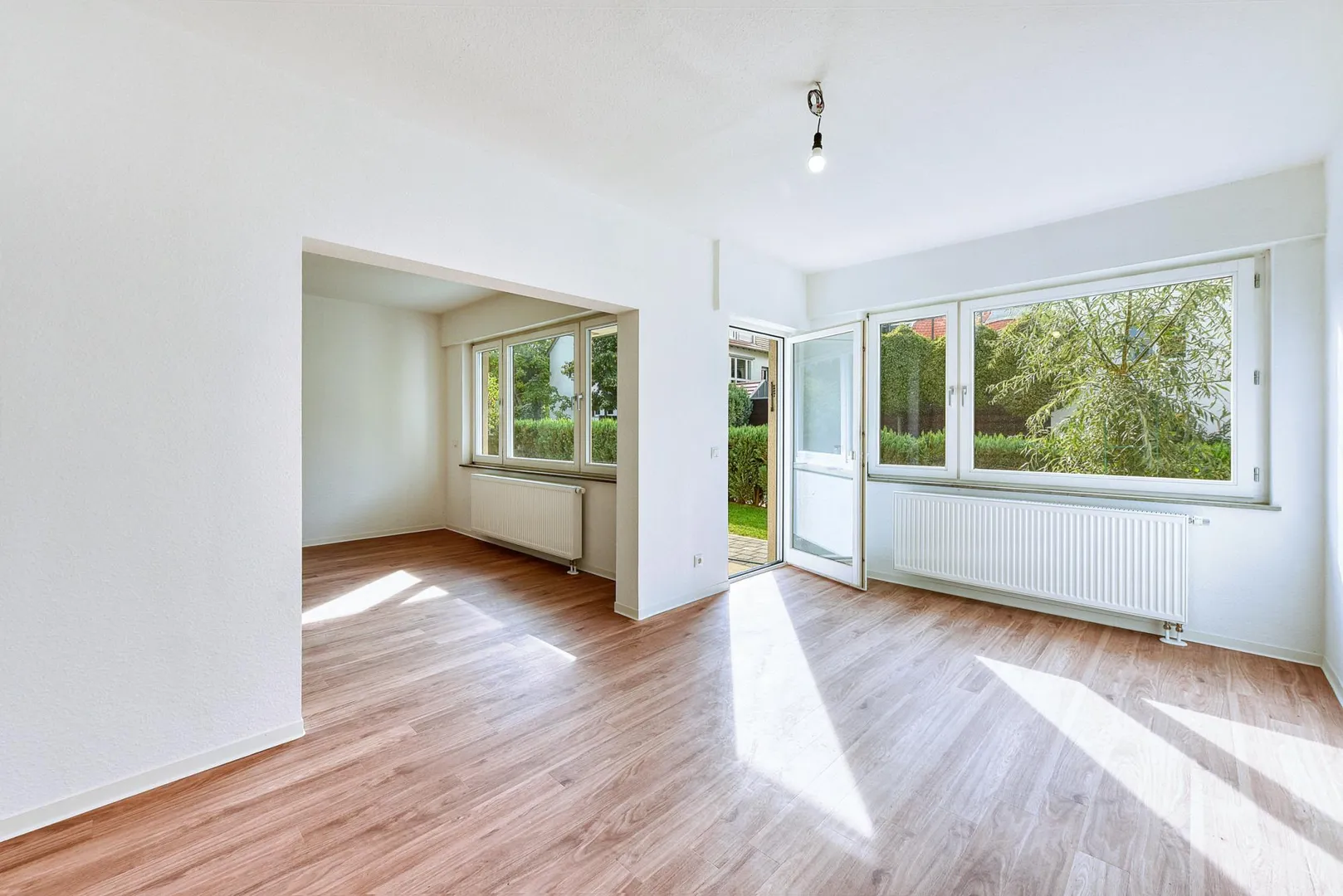 Alle Räume sind direkt von der Diele und vom Flur begehbar. Das Esszimmer ist zum Wohnzimmer mit einem breiten, offenen Durchgang verbunden.