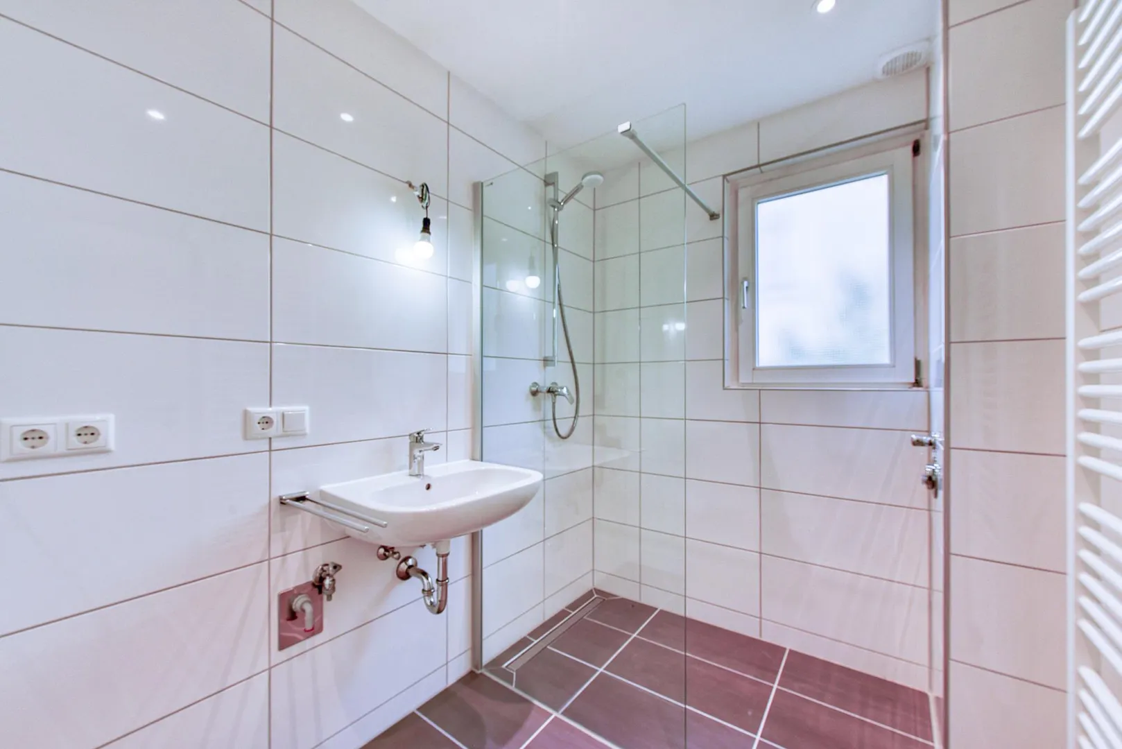 Das raumhoch geflieste Badezimmer ist ausgestattet mit einer bodentiefen Dusche, einem Handtuch-Heizkörper sowie einem Waschmaschinen-Anschluss für eine 45-er Waschmaschine.