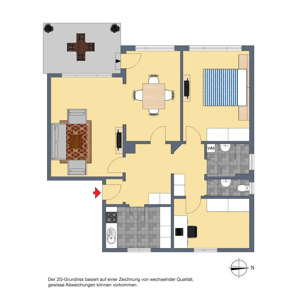 Das Wohnzimmer, das Esszimmer sowie das Schlafzimmer sind nach Westen ausgerichtet. Das Badezimmer sowie das WC sind nach Norden ausgerichtet. Das Arbeitszimmer sowie die Küche sind mach Osten ausgerichtet.