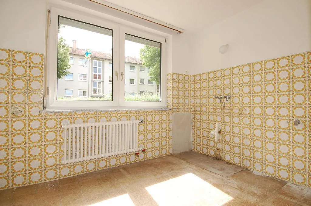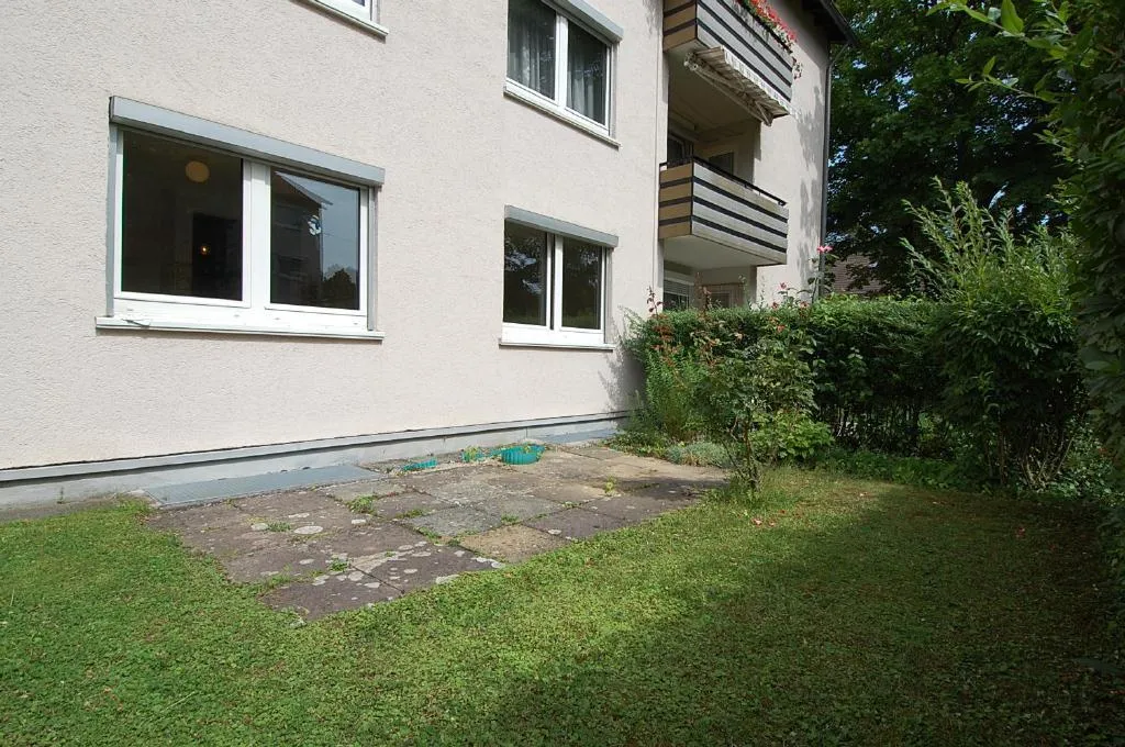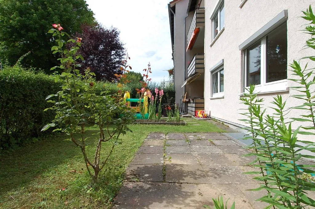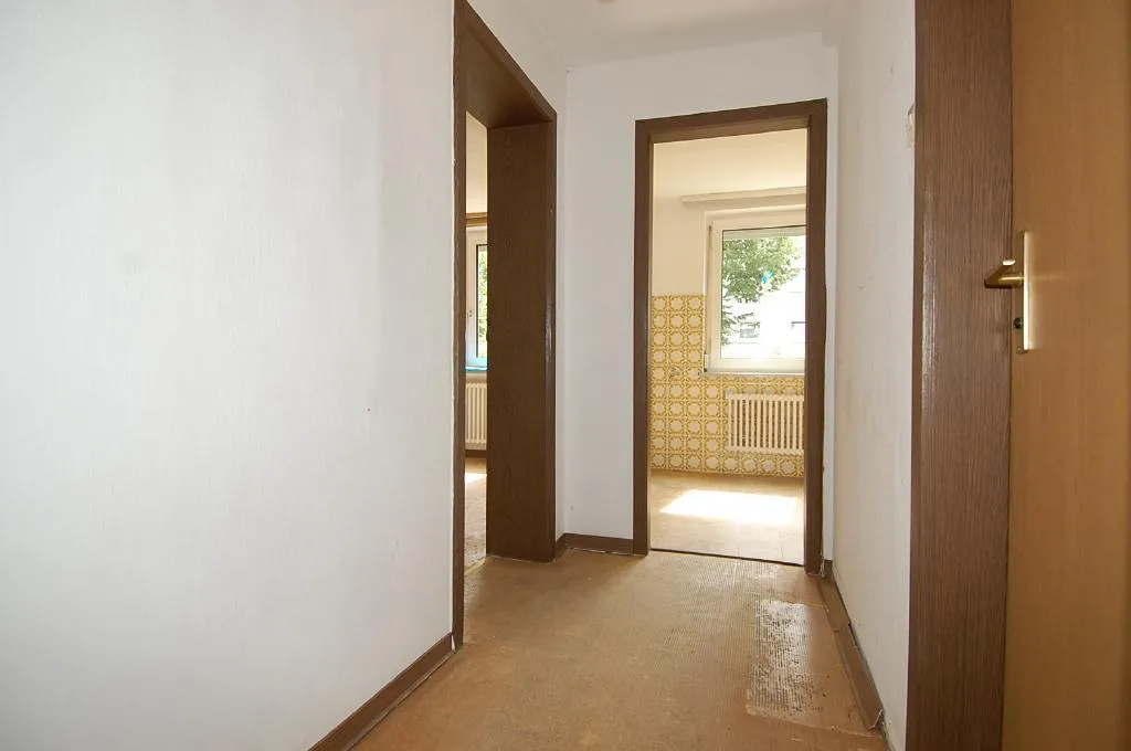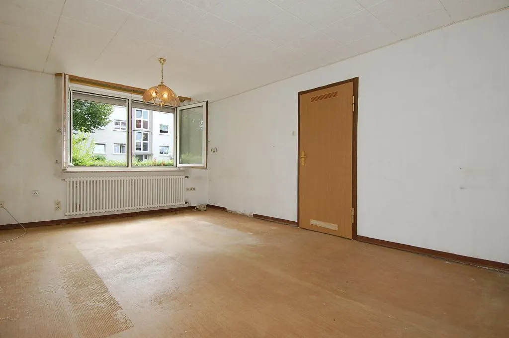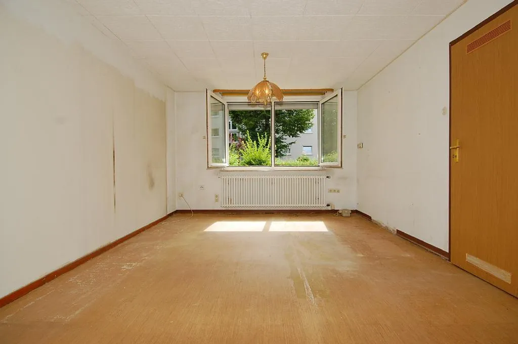 Diese modernisierungsbedürftige 1-Zimmer-Wohnung mit Terrasse und Garten befindet sich im Hochparterre (Erdgeschoss) eines 8-Familien-Reiheneckhauses.