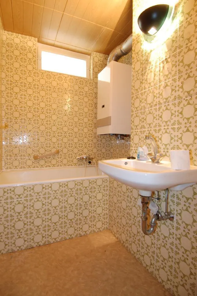 Das ca. 3,3 m² große Badezimmer ist aus dem Ursprungsbaujahr und verfügt über eine Wanne, einen Fliesenboden, ein Waschbecken und ein WC.