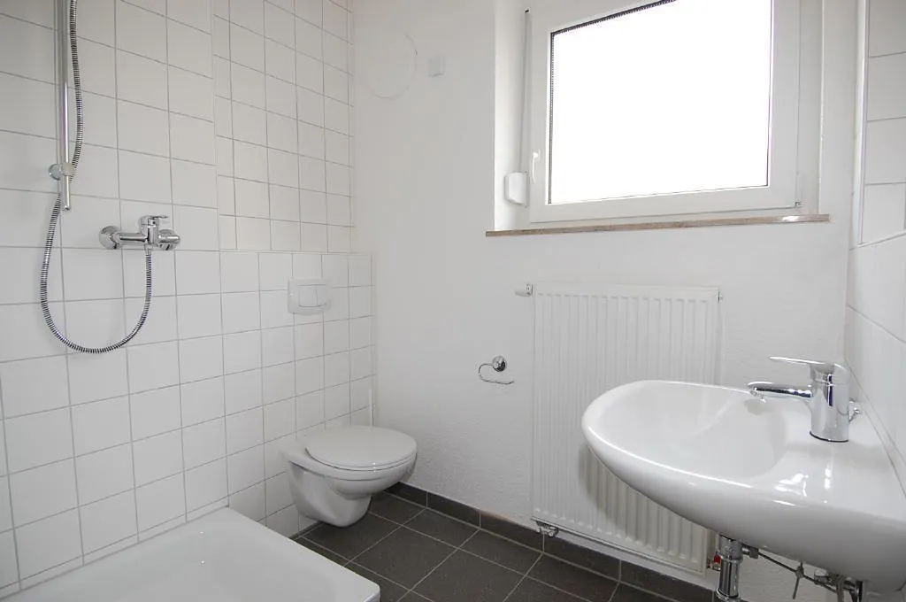 Das Bad ist raumhoch gefliest und mit Fenster, Dusche und WC ausgestattet.