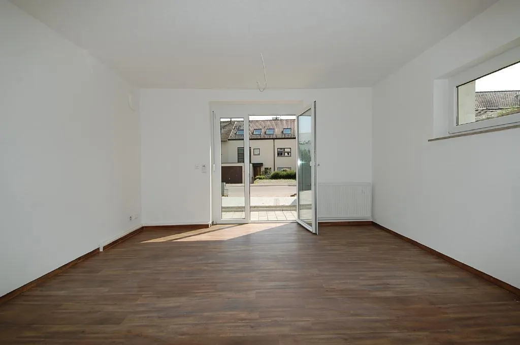 Vom Wohnzimmer aus gelangen Sie auf die 16m² große, teilüberdachte und nach Süden ausgerichtete Terrasse.