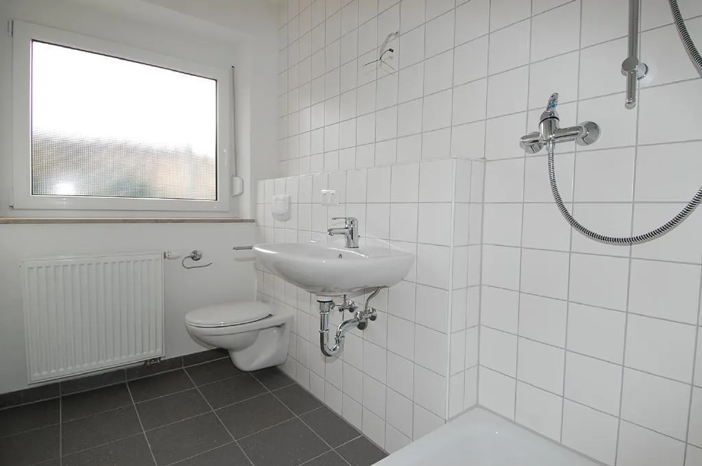 Das Bad ist raumhoch gefliest und mit Fenster, Dusche und WC ausgestattet.