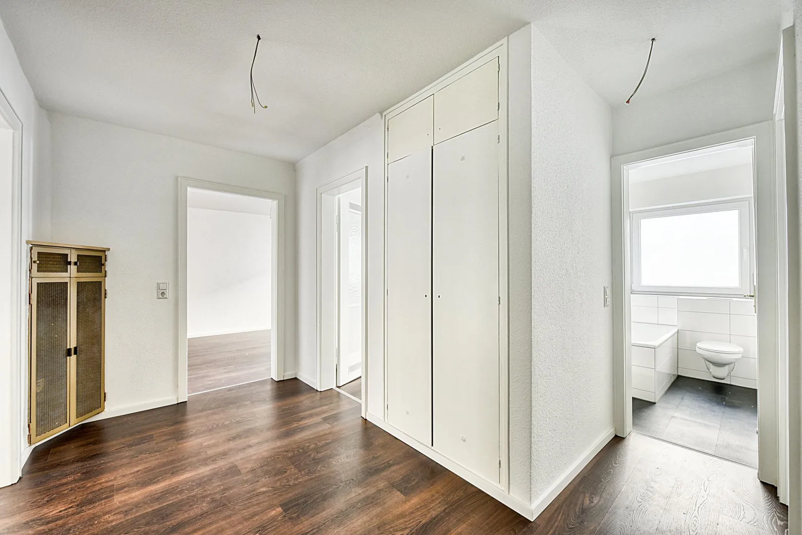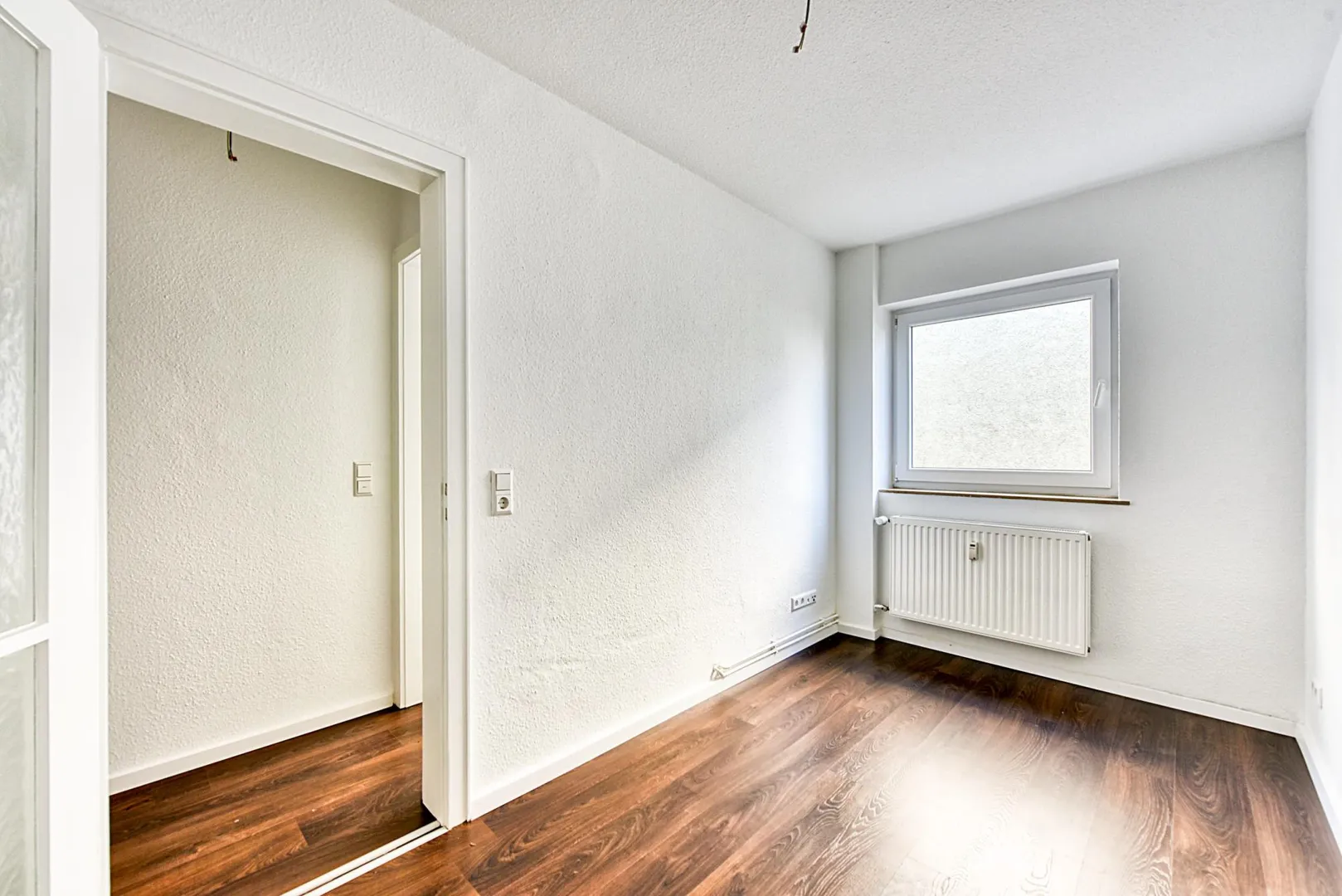 Die Wände sind mit Raufasertapeten tapeziert und frisch, weiß gestrichen. Die Raumhöhen betragen ca. 2,47 Meter.