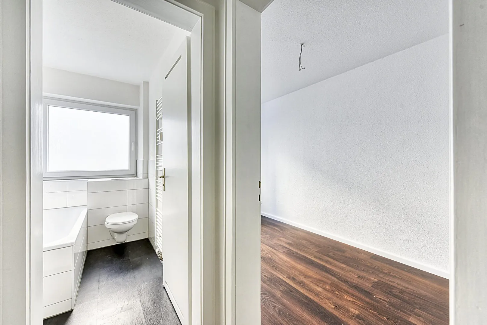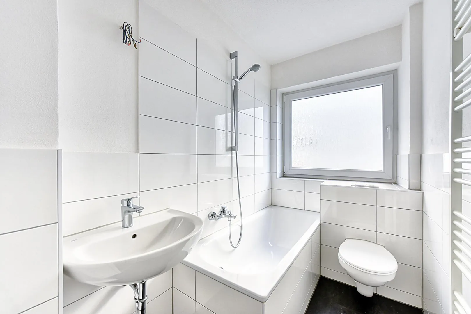 Das teilweise halbhoch und teilweise 2/3-hoch geflieste Tageslicht-Badezimmer ist ausgestattet mit einem Fliesenboden, einer Badewanne, einem WC sowie einem Handtuch-Heizkörper.