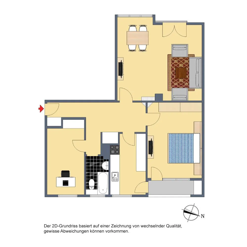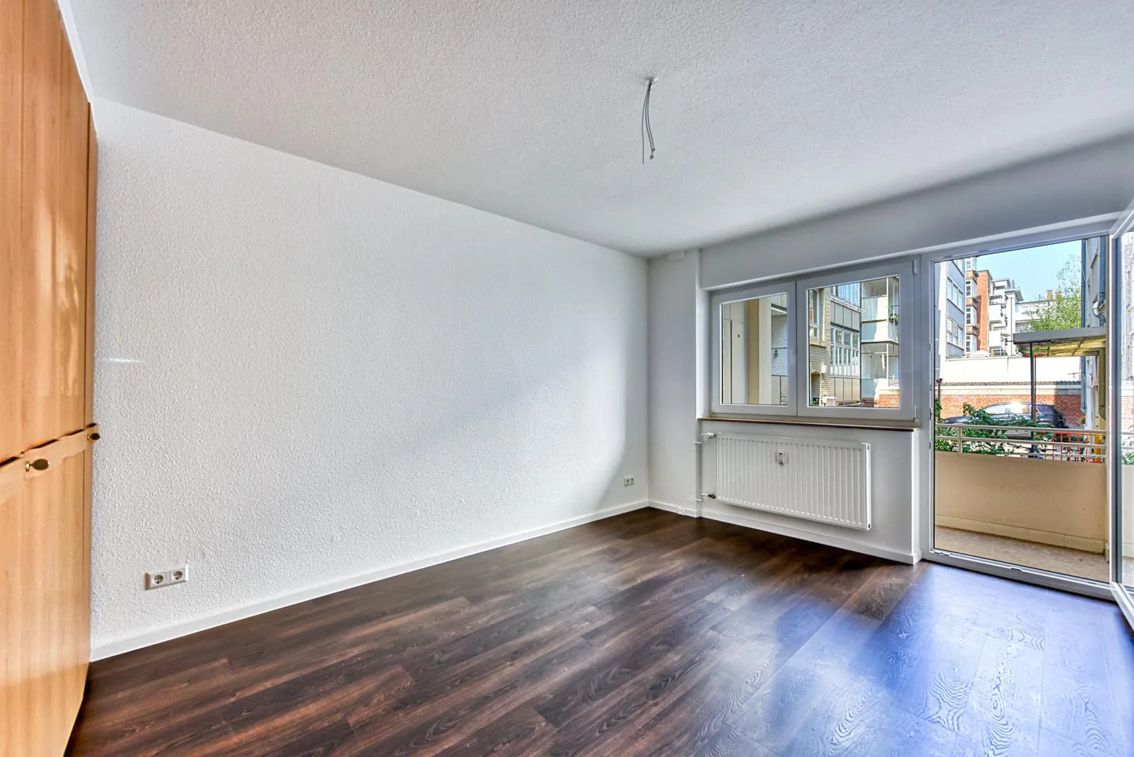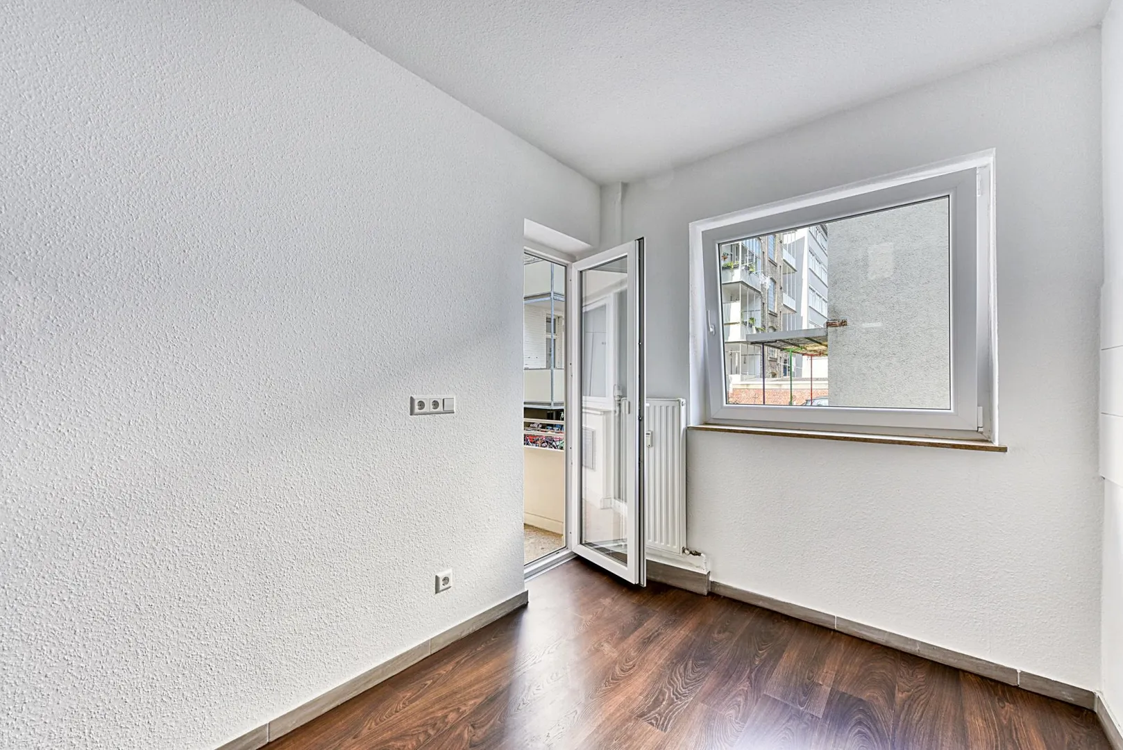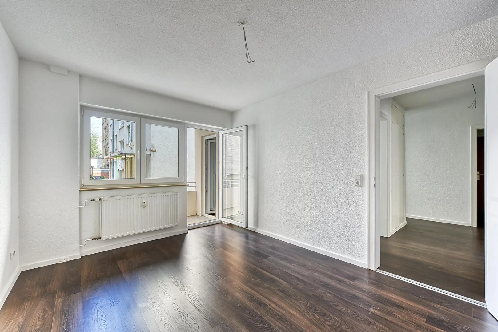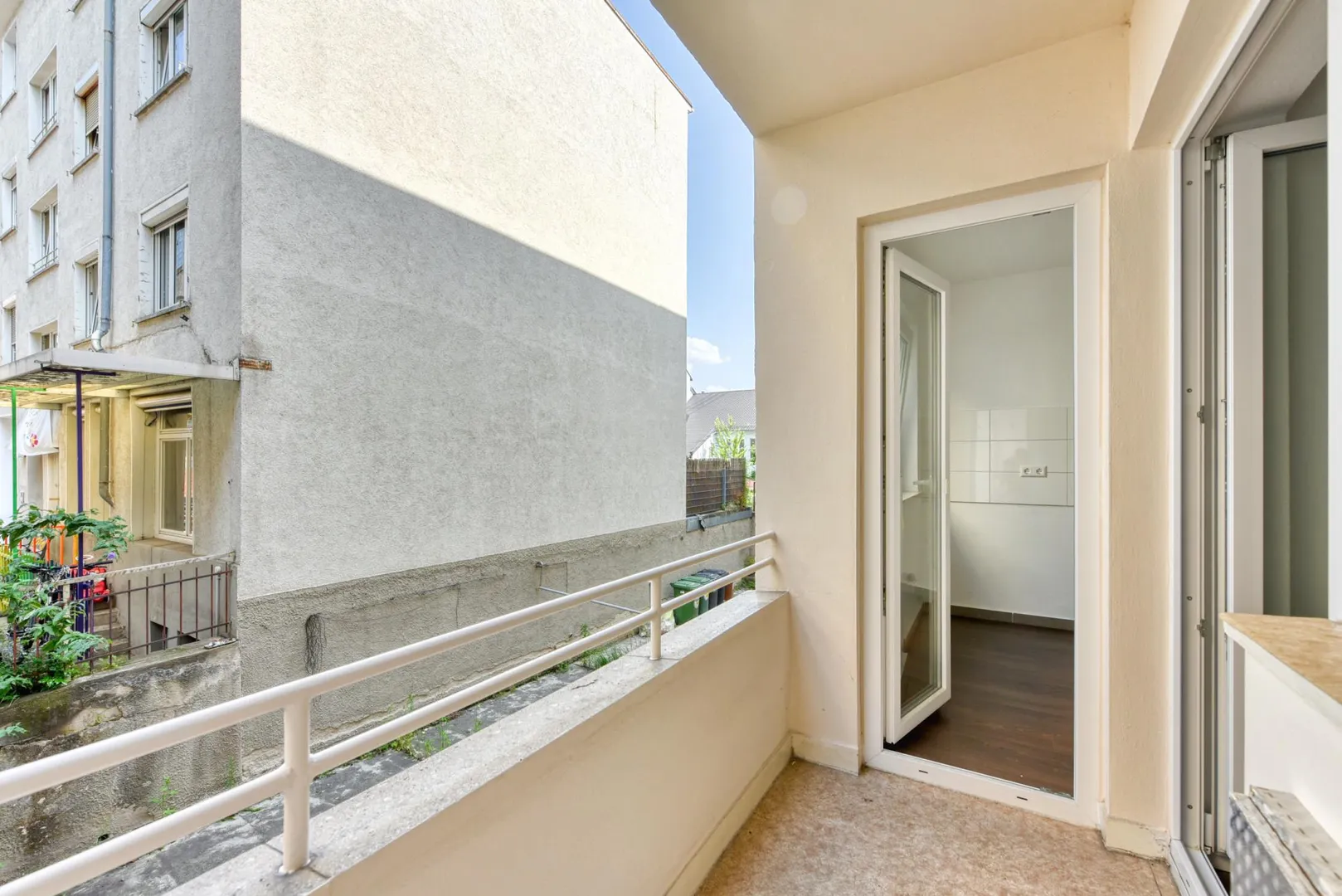 Der Grundriss ist sehr gut: alle Räume sind direkt vom Flur/von der Diele begehbar. Das Badezimmer verfügt über ein Fenster. Der ca. 3 m² große und überdachte Balkon ist sowohl vom Schlafzimmer als auch von der Küche begehbar. Das Wohn-/Esszimmer verfügt über einen französischen Balkon.