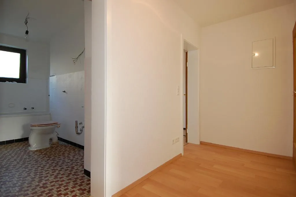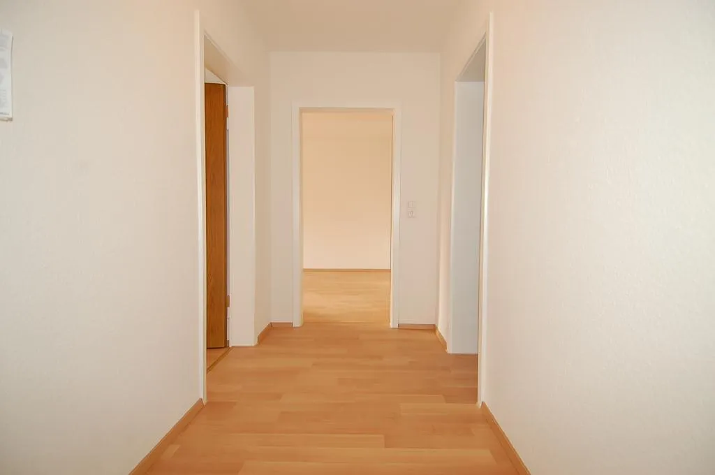 Im Flur und in den Zimmern wurde neuer Laminatboden verlegt. Die Wände und Decken wurden mit Raufaser tapeziert und frisch gestrichen.