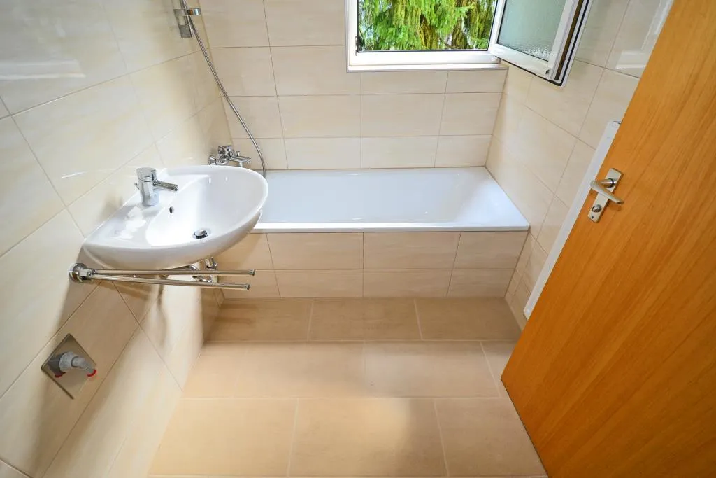 Das Tageslicht-Badezimmer wurde raumhoch gefliest und mit einer Badewanne sowie einem Waschmaschinenanschluss ausgestattet.