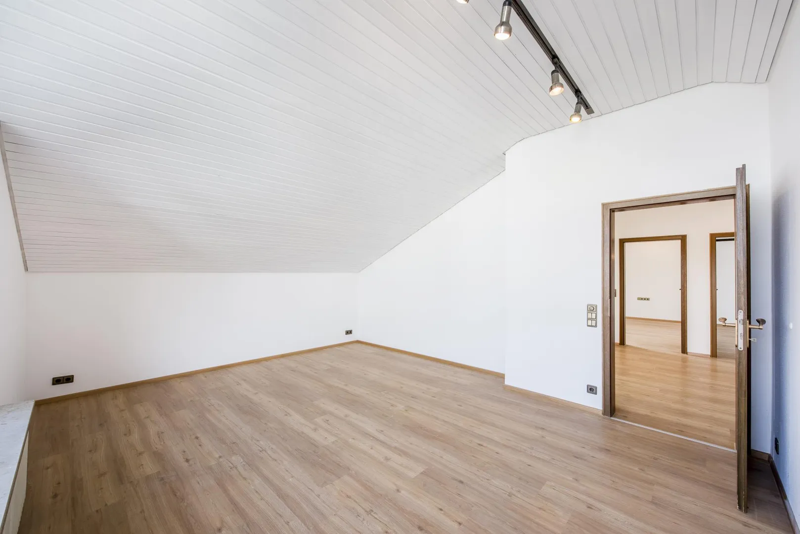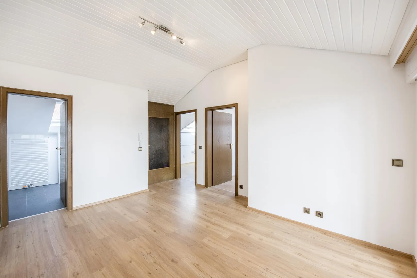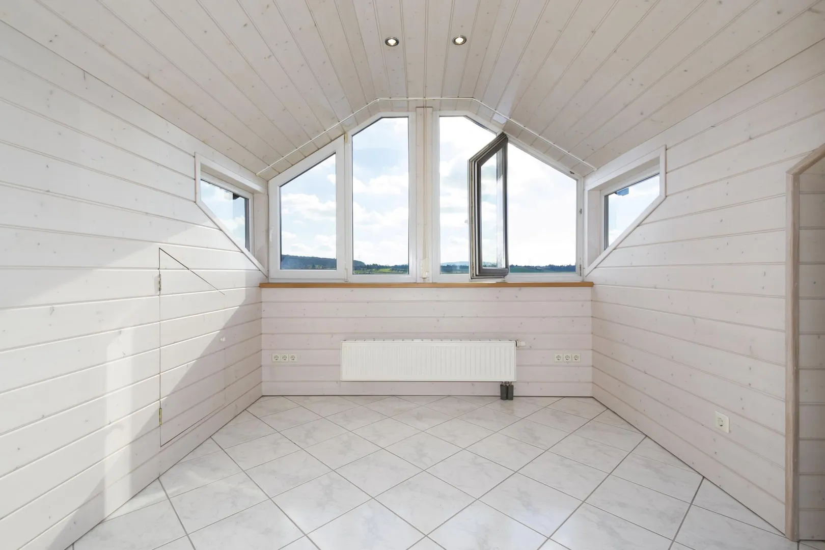 Die Decken sind mit Holz verkleidet sowie frisch, weiß gestrichen.