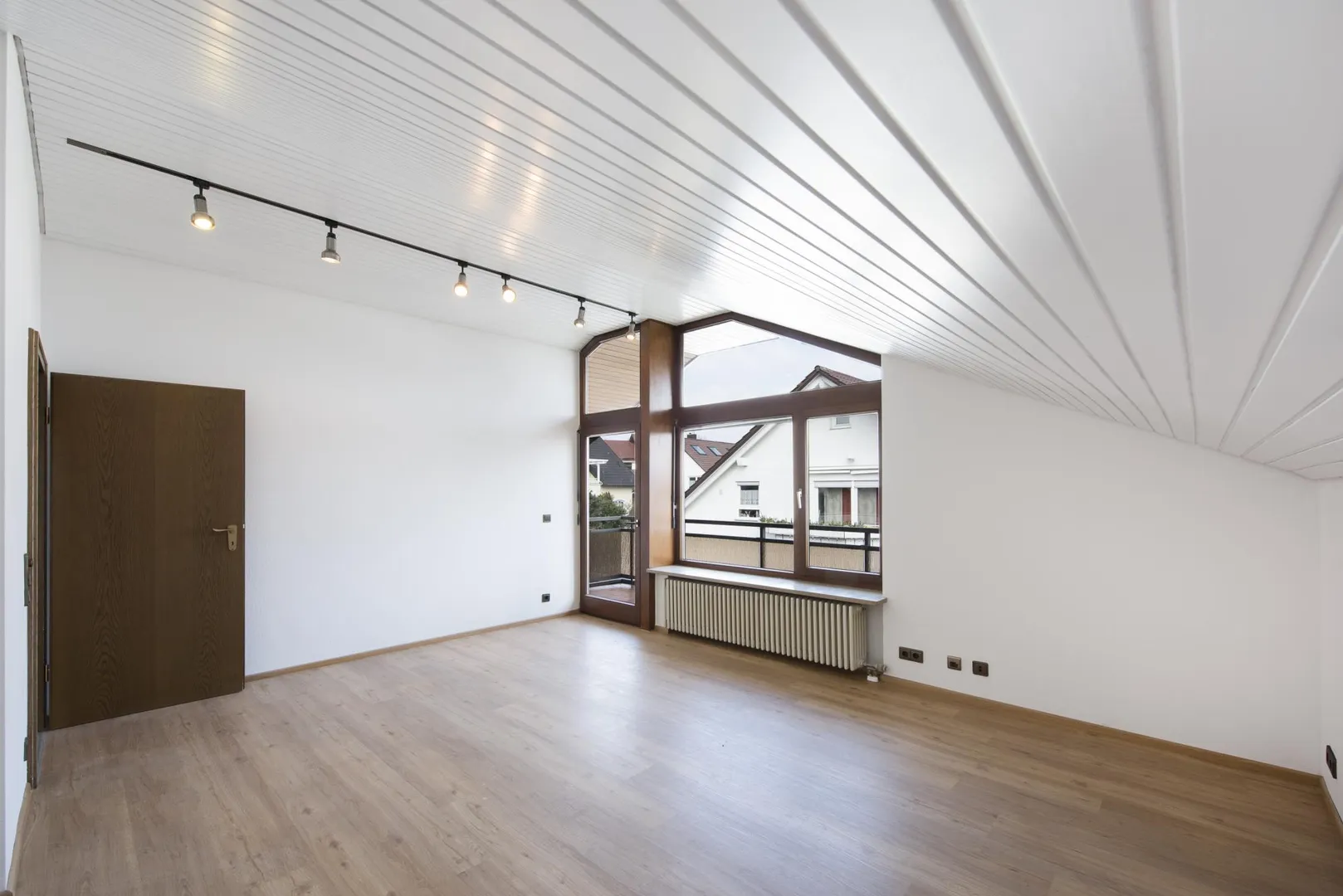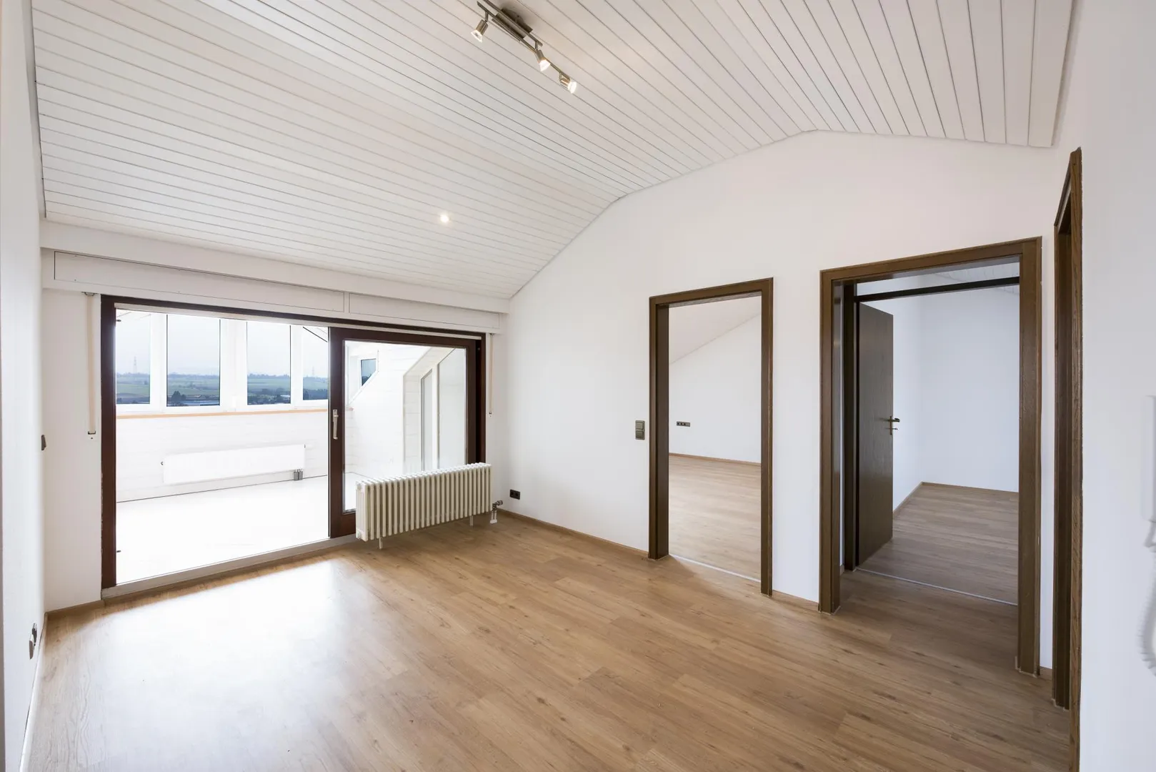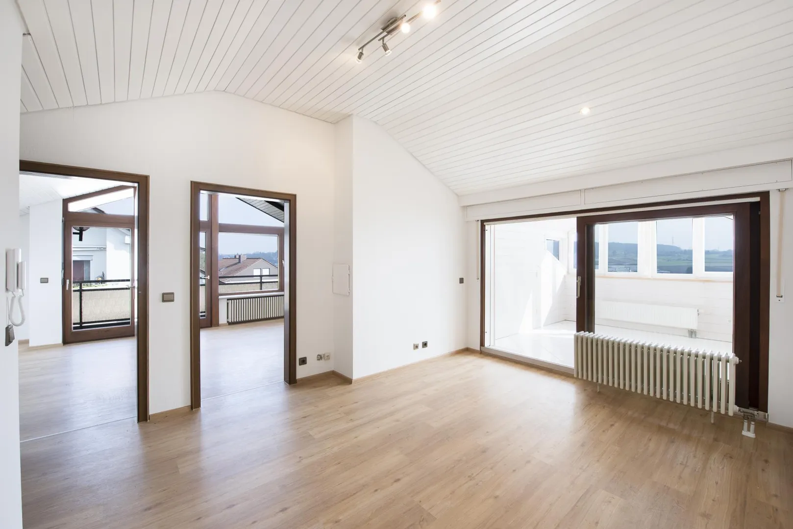 Die Decken sind mit Holz verkleidet sowie frisch, weiß gestrichen.