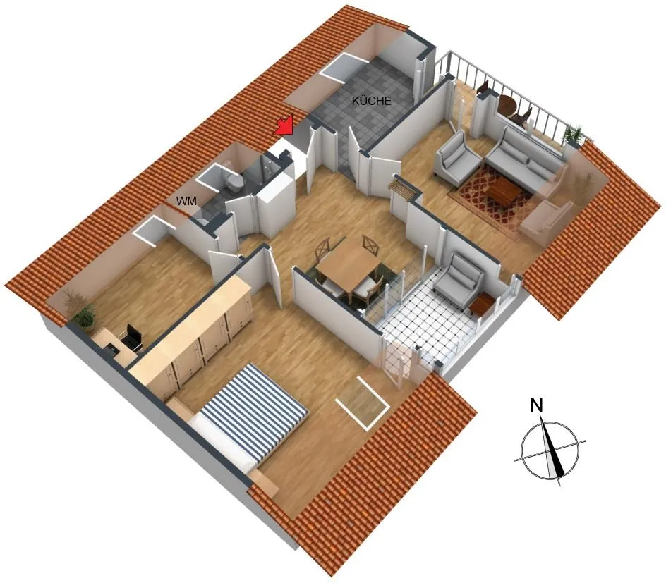 Das Wohnzimmer ist nach Süd/Osten ausgerichtet. Das Schlafzimmer sowie der "Wintergarten" sind nach Süd-Westen ausgerichtet. Das Arbeitszimmer und das Badezimmer sind nach Nord-Osten ausgerichtet. Die Küche ist nach Osten ausgerichtet.