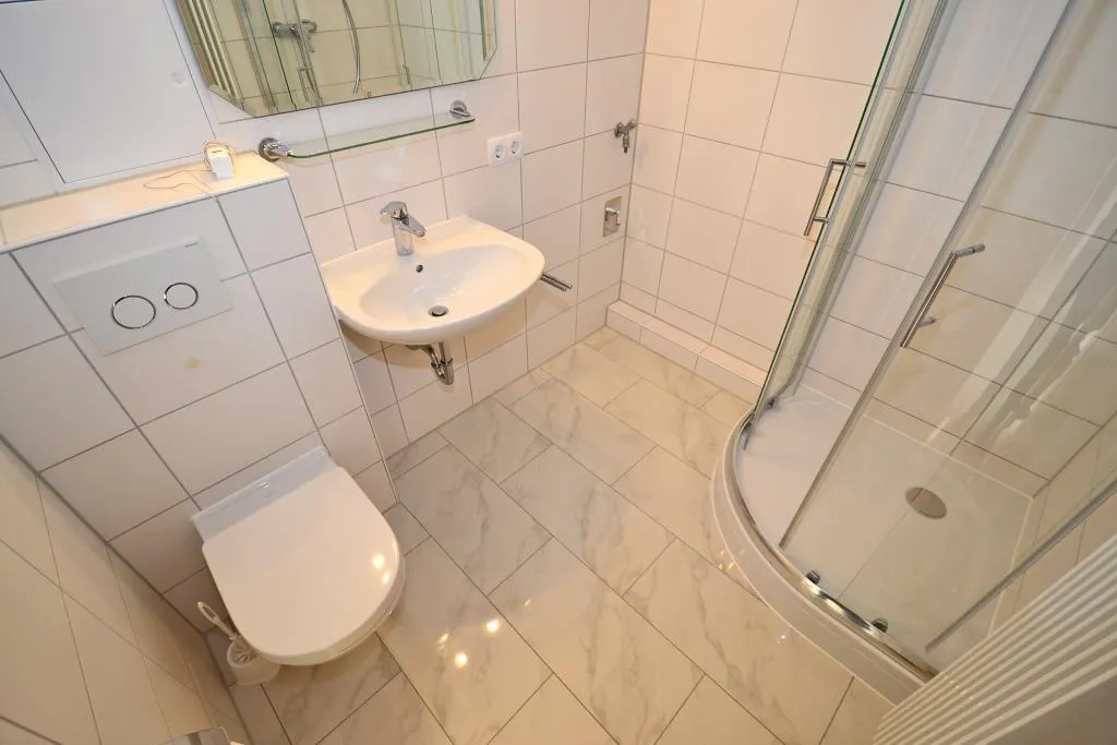 Das raumhoch geflieste Badezimmer ist ausgestattet mit einer Dusche, einem WC, einem Waschmaschinenanschluss sowie einem Spiegel mit Beleuchtung.