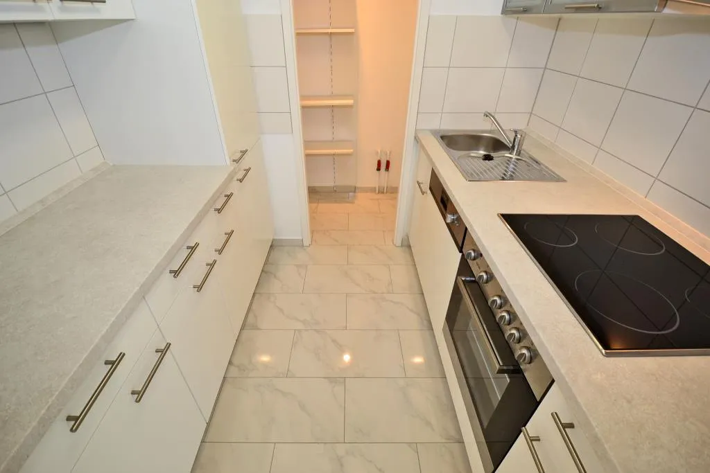 In den Zimmern wurde Laminat verlegt. Die Böden im Flur, in der Küche, im Badezimmer und im Abstellraum sind gefliest.