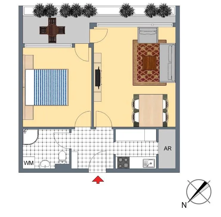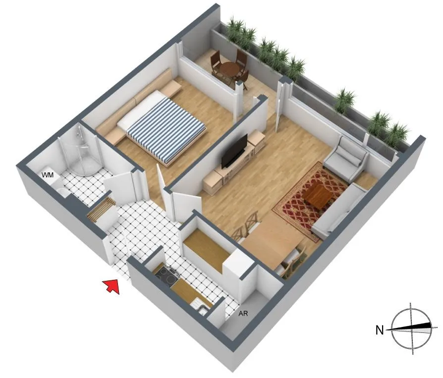 Der Grundriss der Wohnung ist gut. Alle Räume sind vom Flur begehbar. Der überdachte, ca. 8 m² große Süd-Ost Balkon mit einer elektrischen Markise und einem Pflanzbeet ist über das Wohnzimmer und über das Schlafzimmer begehbar. Hinter der Küche befindet sich eine Speisekammer.