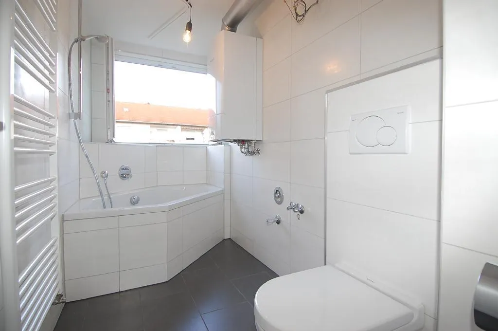 Das moderne Tageslicht-Badezimmer ist raumhoch gefliest, verfügt über ein Fenster, einen Fliesenboden, einen Elektro-Radiator, eine Wanne, ein WC, einen Handtuchheizkörper und ein Waschbecken.