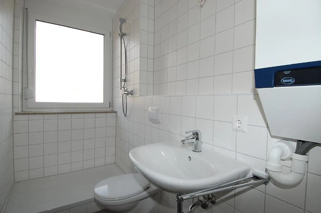 Das Bad ist raumhoch gefliest und mit Fenster, Dusche und WC ausgestattet.
