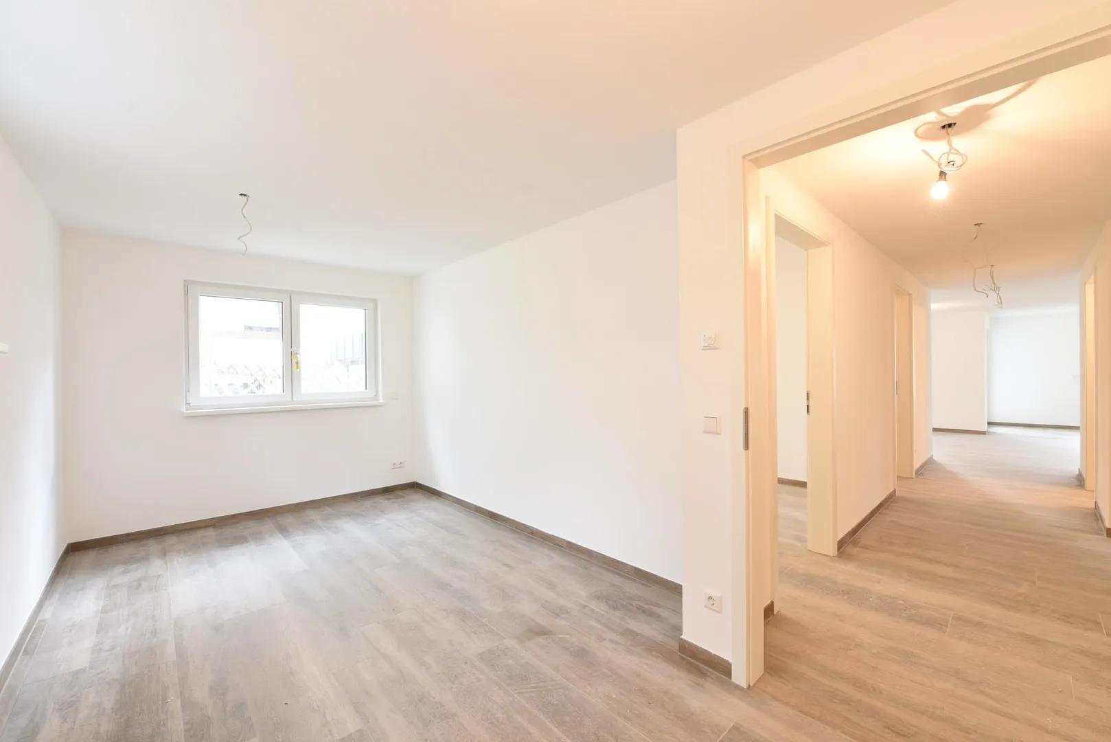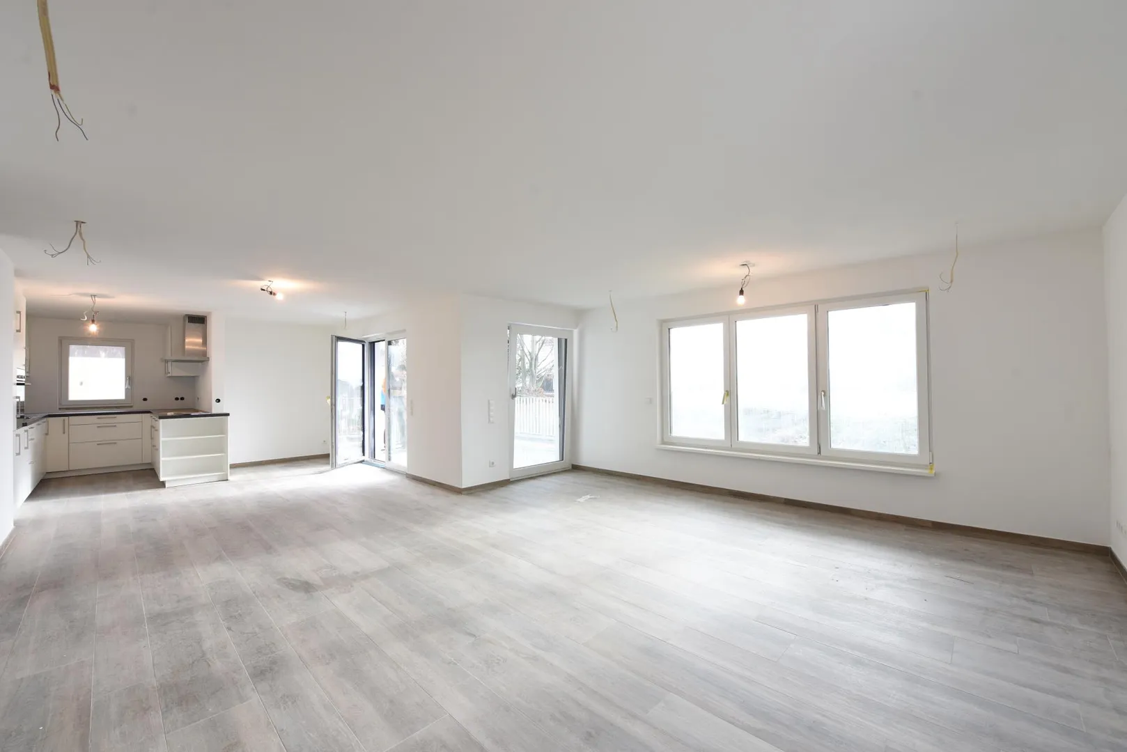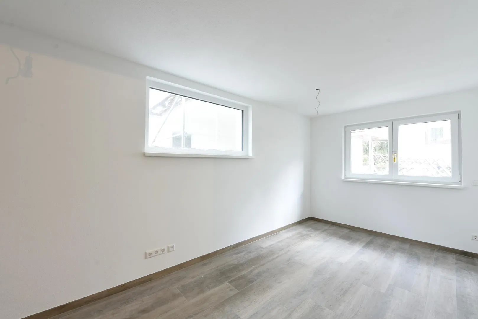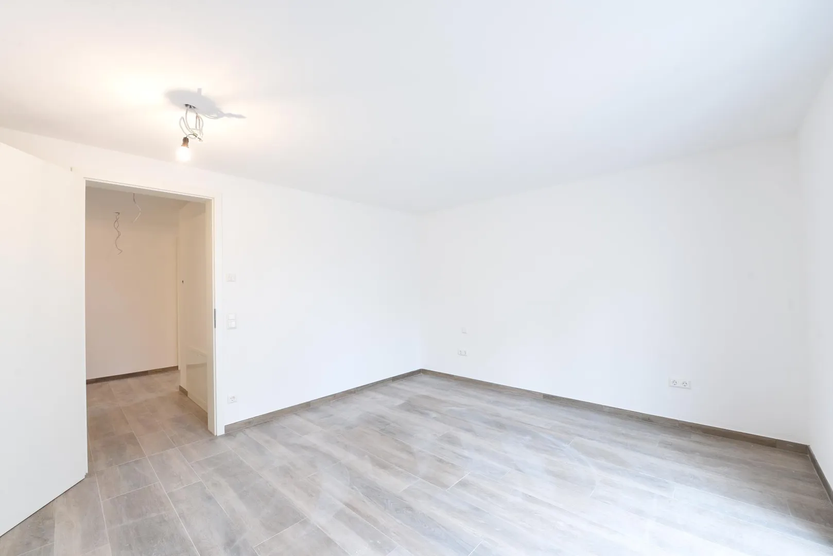 Alle Böden sind mit Feinsteinzeug in Holzoptik ausgelegt. Die Wände sind mit Mineralputz verputzt. Die Raumhöhen betragen ca. 2,34 Meter.