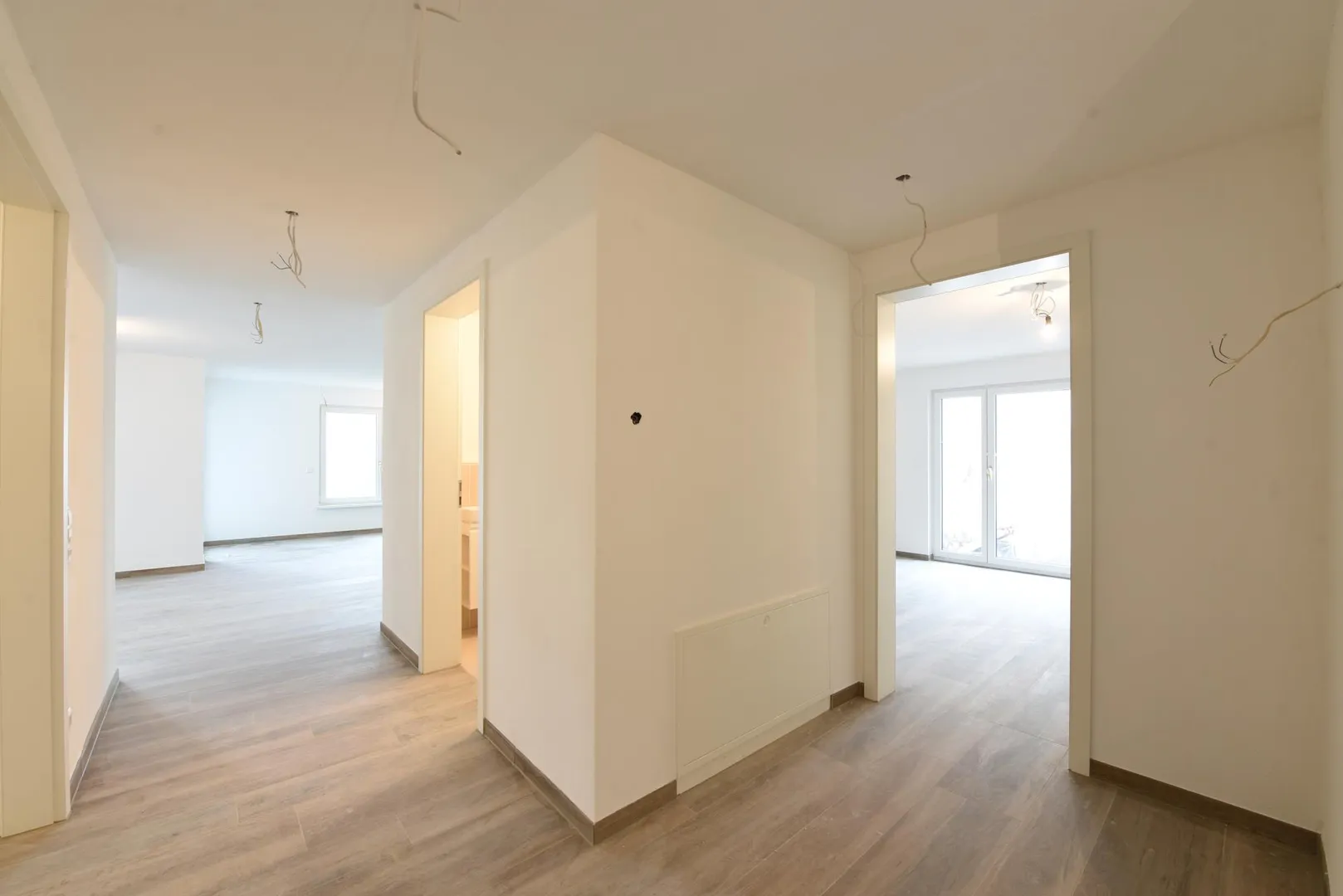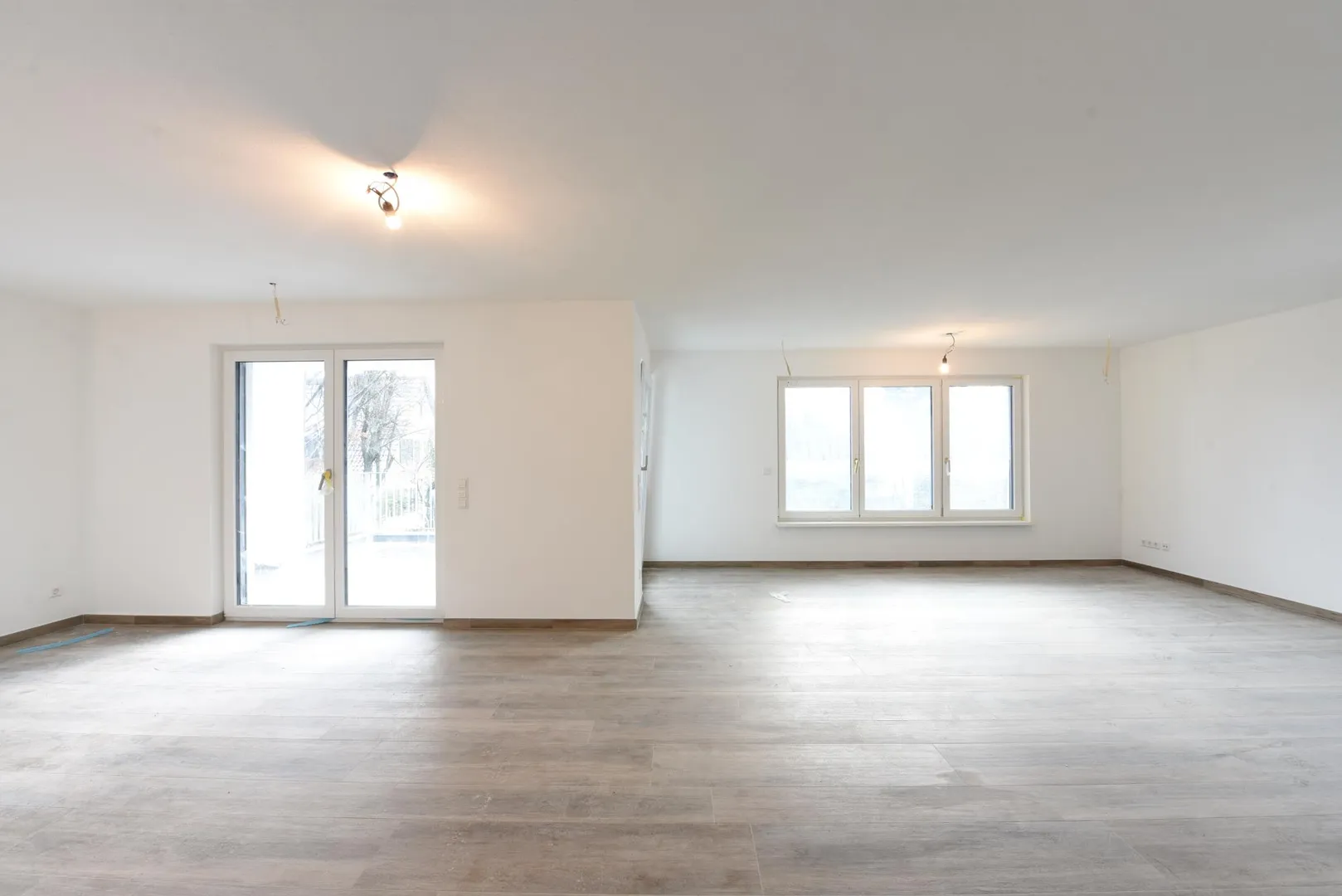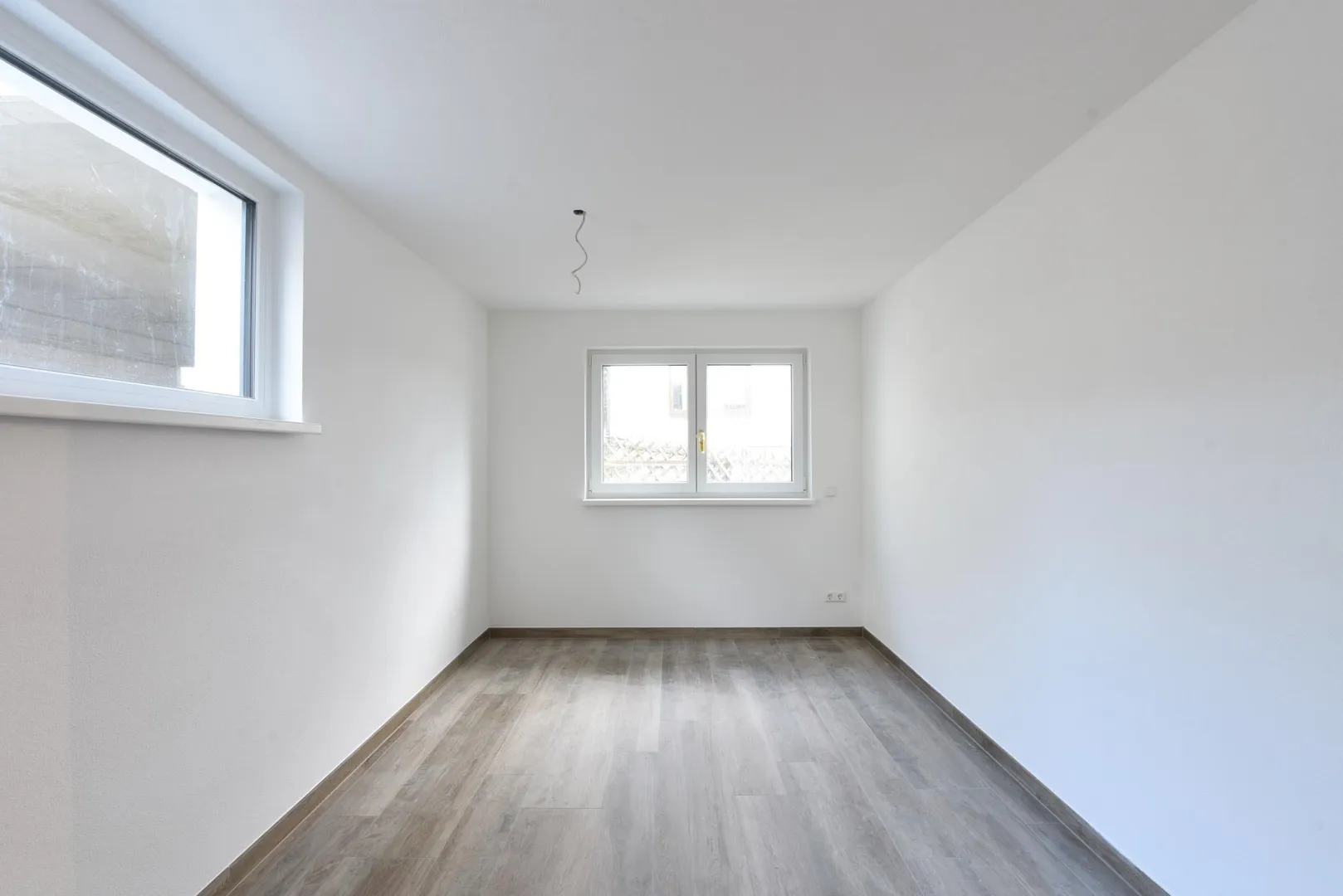 Alle Böden sind mit Feinsteinzeug in Holzoptik ausgelegt. Die Wände sind mit Mineralputz verputzt. Die Raumhöhen betragen ca. 2,34 Meter.