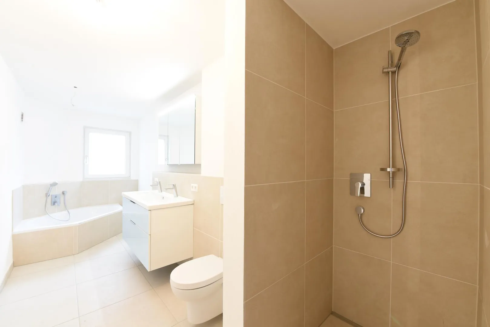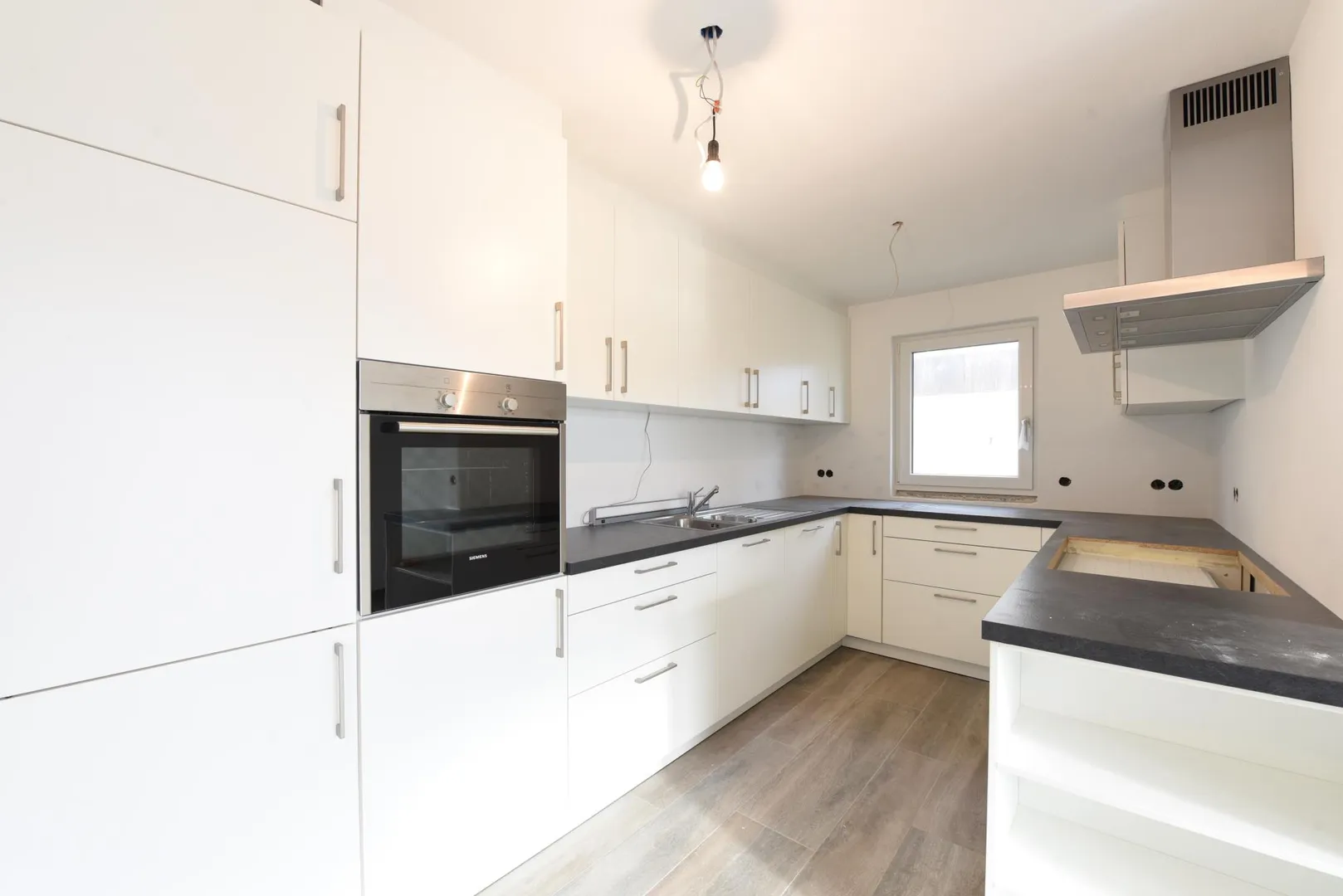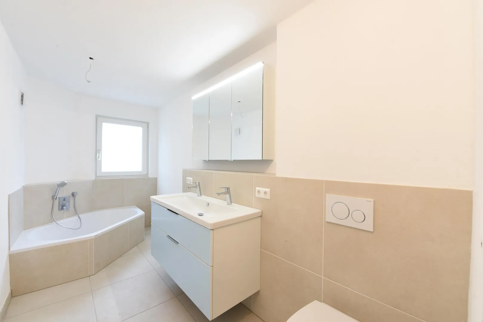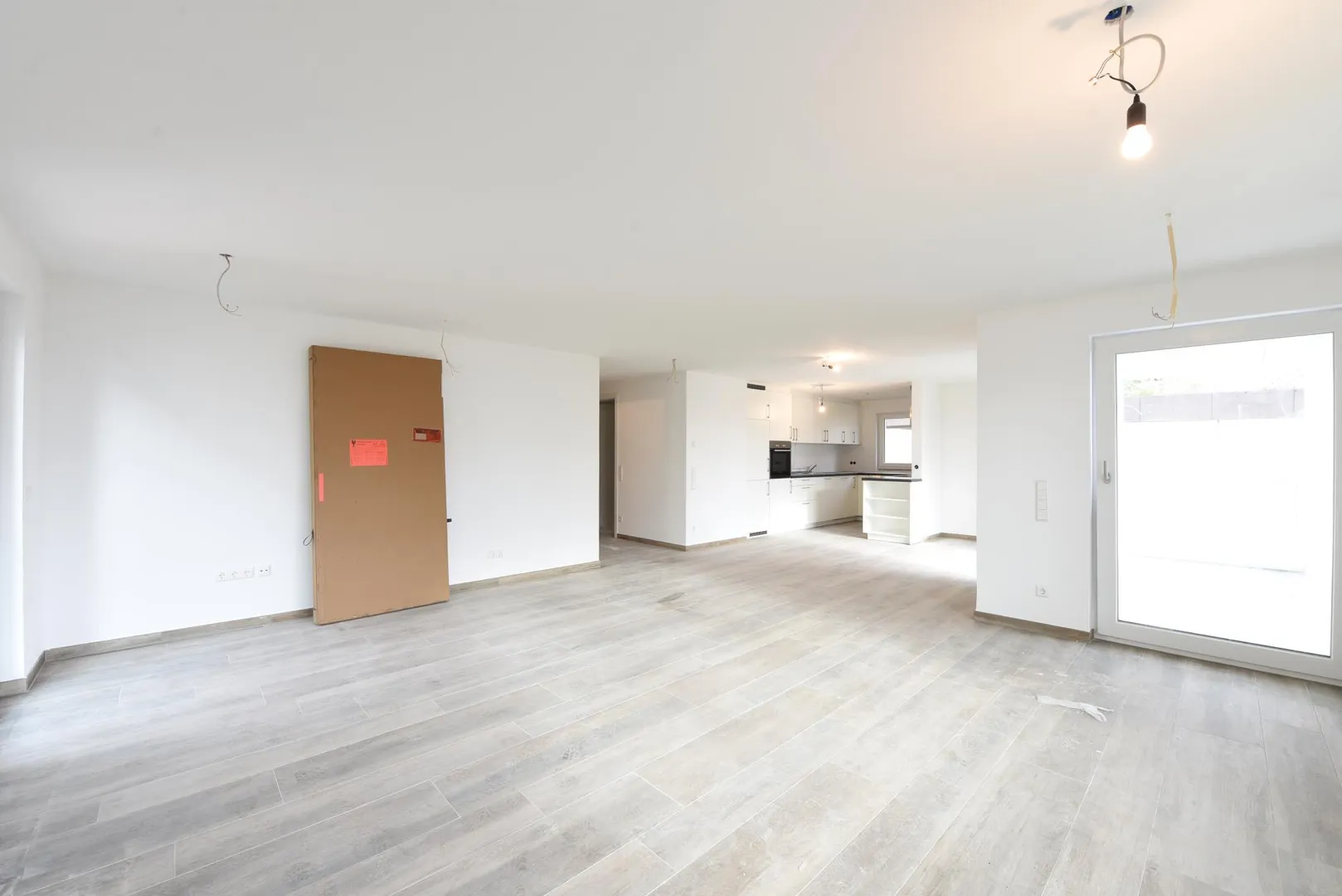 Alle Böden sind mit Feinsteinzeug in Holzoptik ausgelegt. Die Wände sind mit Mineralputz verputzt. Die Raumhöhen betragen ca. 2,34 Meter.