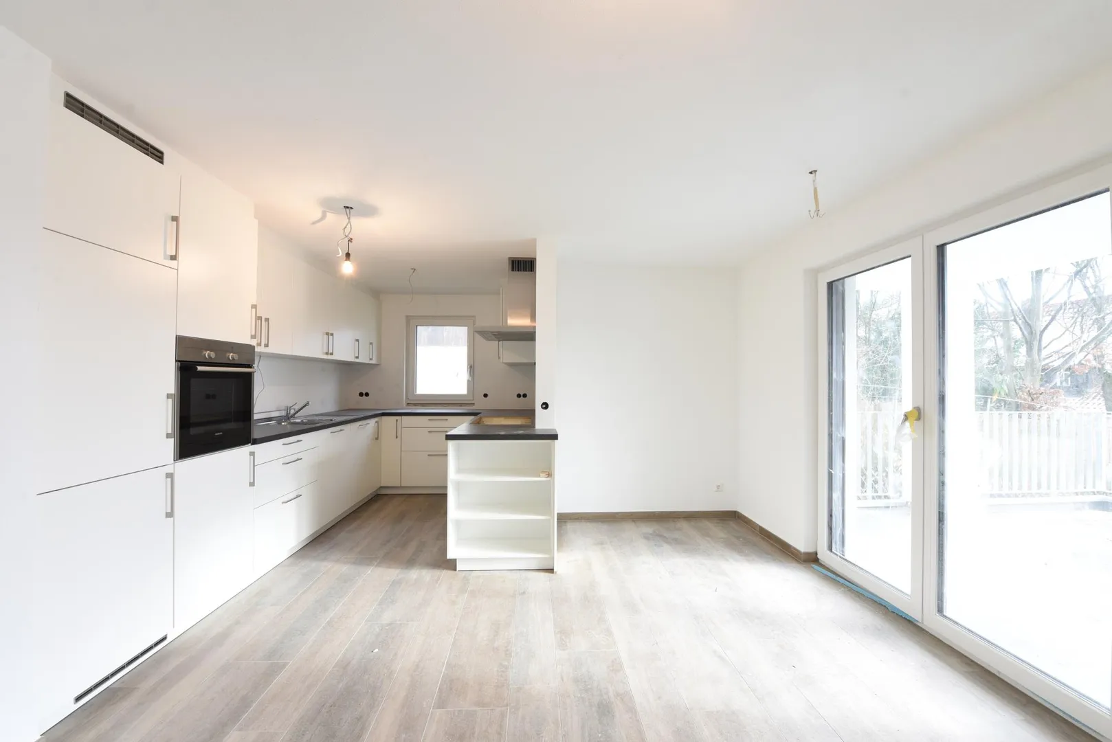 Die offene Küche ist mit einer hochwertigen Einbauküche ausgestattet.