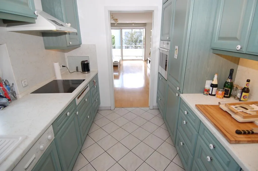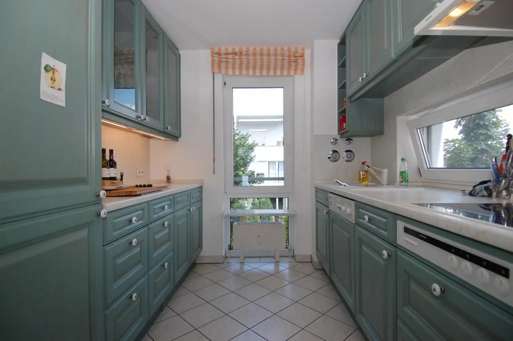 Die Küche ist mit einer Schiebetür und einer Einbauküche mit holzfurnierten, grünen Fronten ausgestattet. Die Einbauküche verfügt über einen Herd mit Backofen, einen Kühlschrank, einen Gefrierschrank, eine Spülmaschine, eine Dunstabzugshaube, Massivholz-Ober- und Unterschränke.