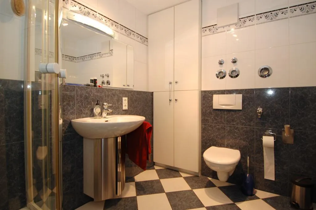 Das raumhoch, hochwertig geflieste Badezimmer ist mit einer Dusche, einem WC, einem Handtuchheizkörper, einem Waschmaschinenanschluss, einem Einbauschrank, einem Spiegel, einem Waschtisch-Unterschrank und einer Spiegellampe ausgestattet.