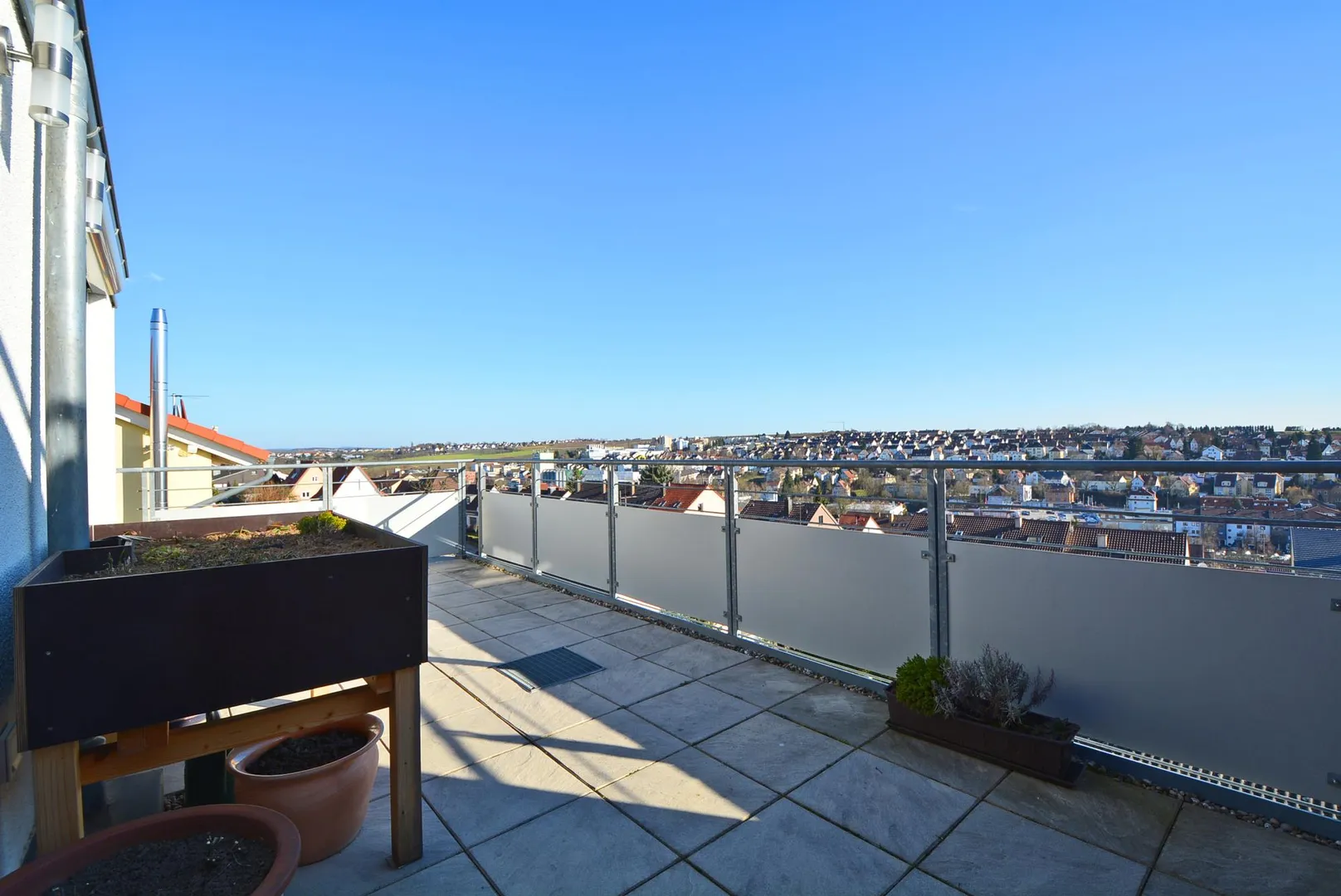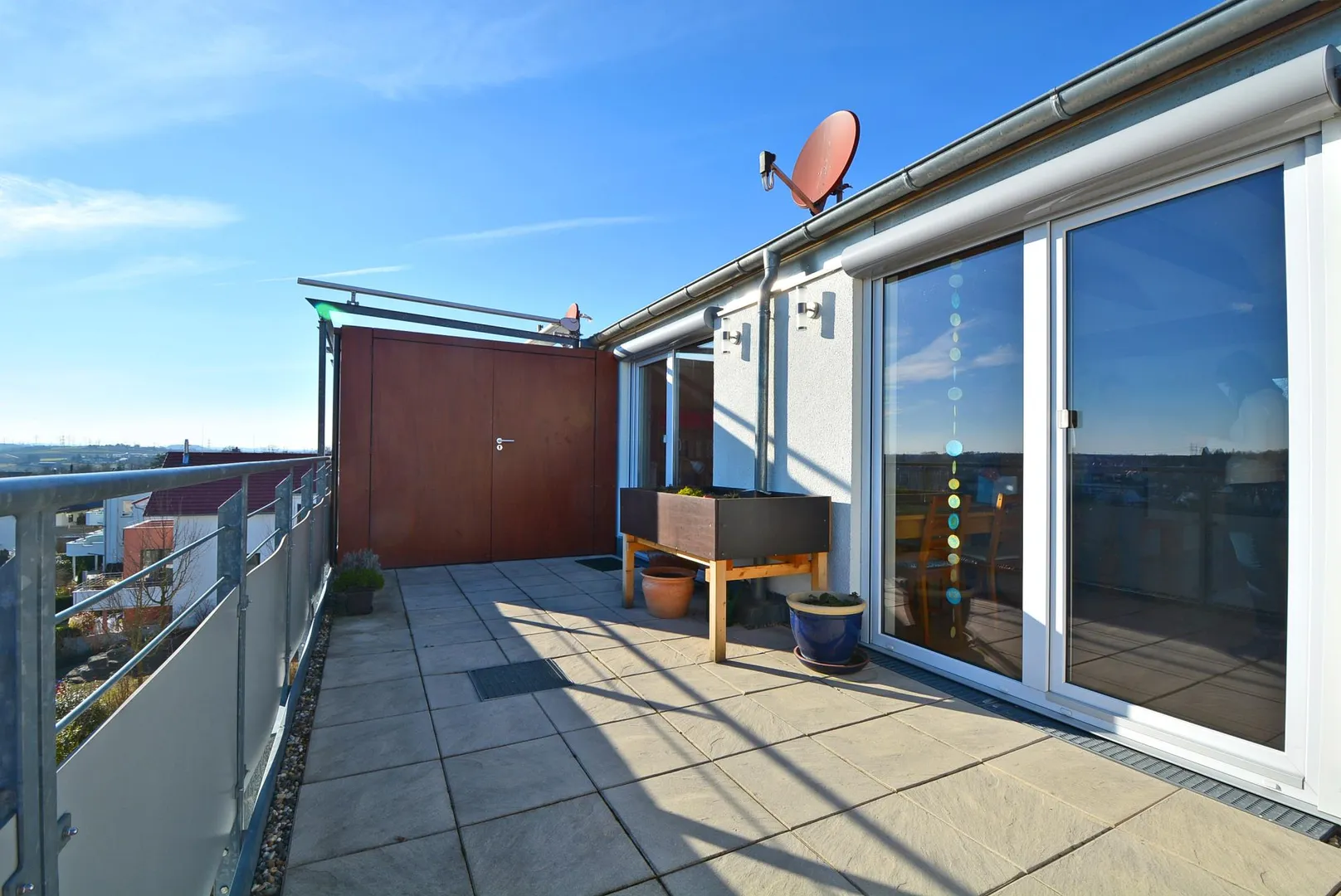 Die ca. 15 m² große und uneinsehbare Süd-Terrasse mit traumhafter Panorama-Fernsicht verfügt über einen Abstellraum für Terrassenmöbel.