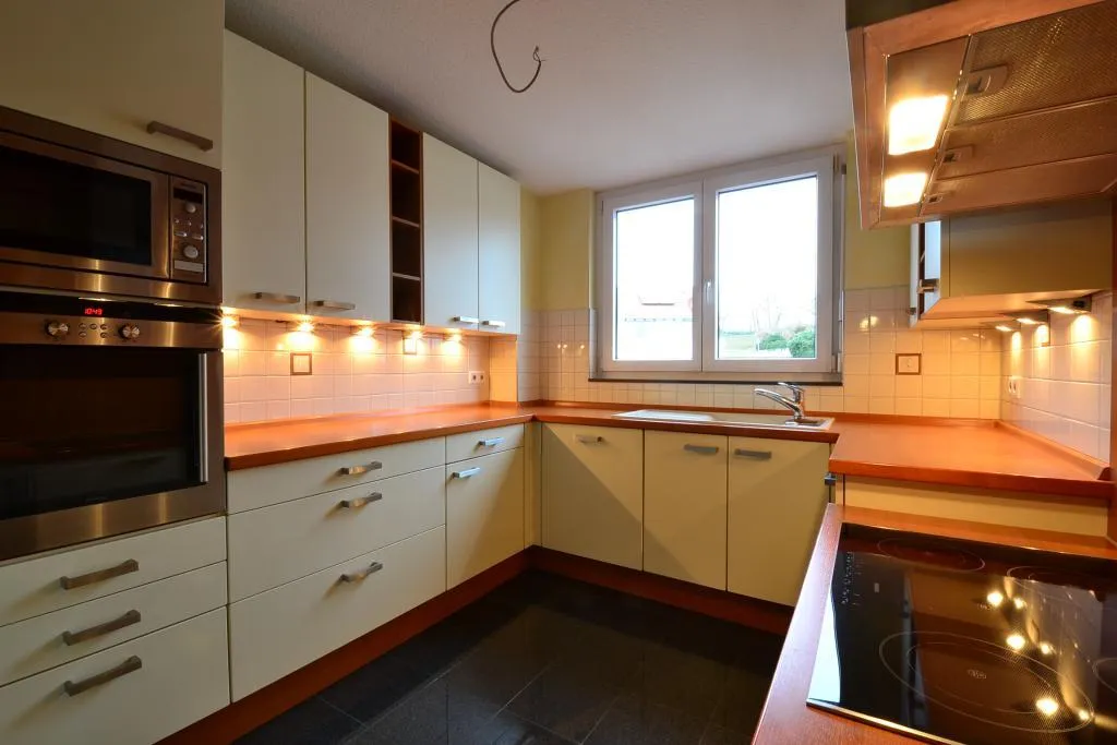 Die Küche ist mit einem Fliesenboden und einer Einbauküche ausgestattet. Die Einbauküche beinhaltet einem Kühlschrank mit Gefrierfach, eine Induktions-Kochfeld, einen Dunstabzug nach Außen, einen Backofen, eine Spülmaschine, eine Mikrowelle sowie Ober- und Unterschränke. Alle E-Geräte sind aktuell funktionsfähig. Für die künftige Funktionsfähigkeit der E-Geräte übernimmt der Vermieter keine Haftung.