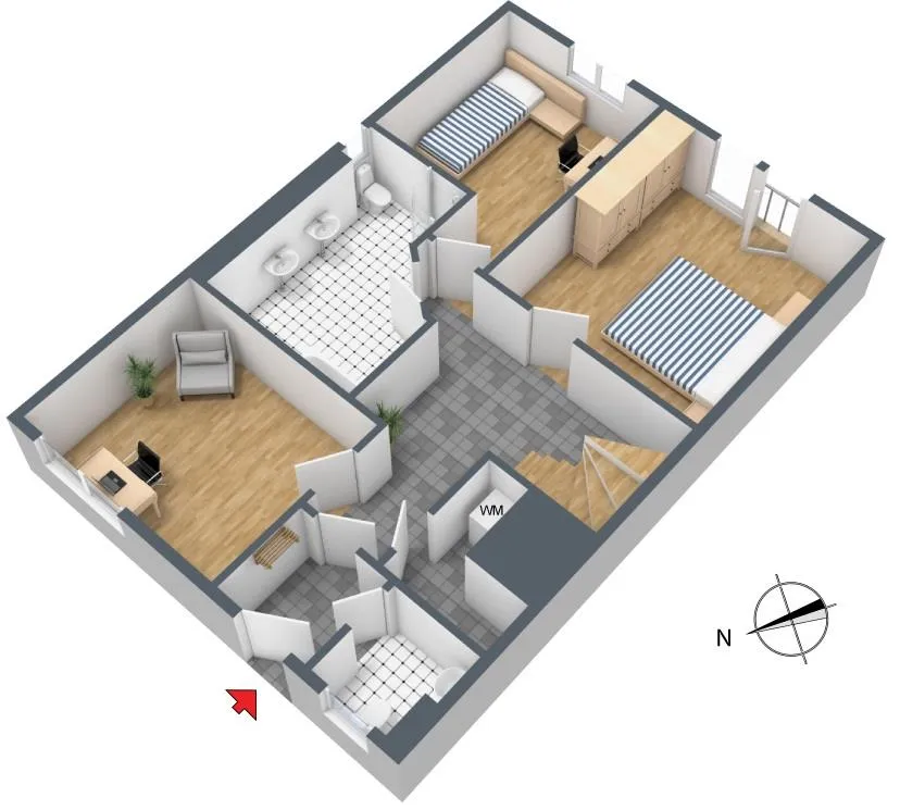 Im Obergeschoss befinden sich ein Windfang, 3 Zimmer, ein Badezimmer, ein separates WC sowie ein Abstellraum mit Waschmaschinenanschluss.