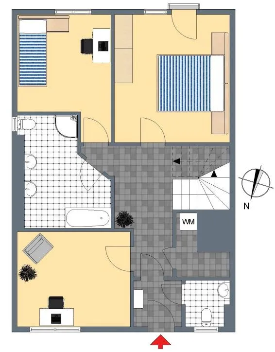 Die Wohnung ist über ein Außen-Treppenhaus und einem separaten Eingang begehbar ("Haus-im-Haus"-Charakter).