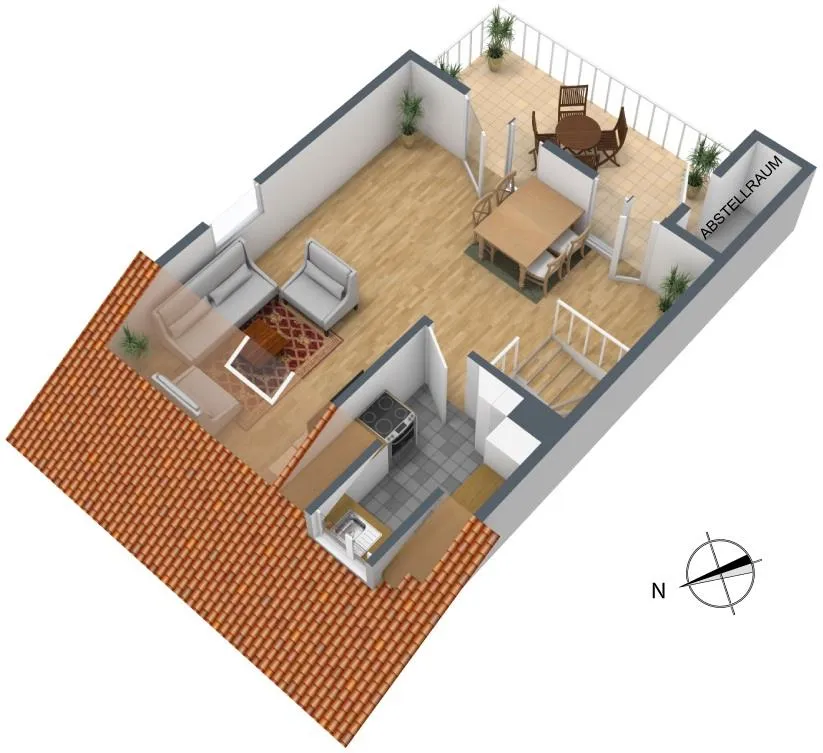 Im Dachgeschoss befinden sich ein offener Wohn-Essbereich, eine Küche sowie eine Terrasse.
