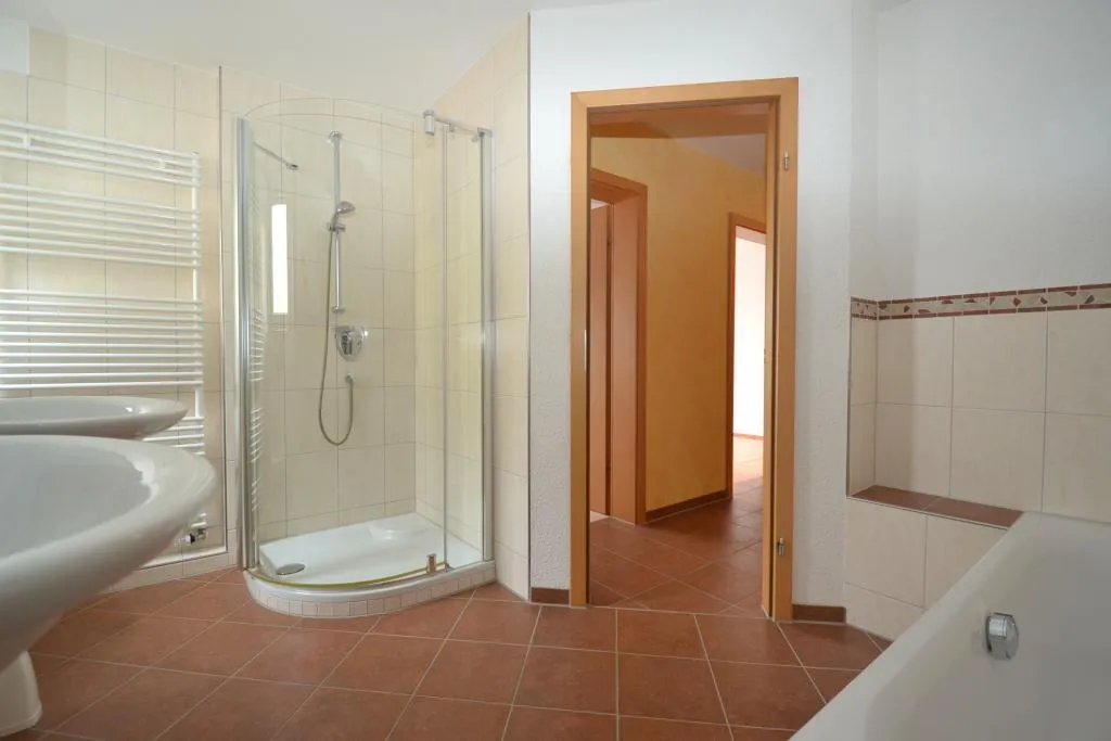 Das teilweise raumhoch geflieste Tageslicht-Badezimmer ist ausgestattet mit einer Wanne, einer Dusche, einem Doppelwaschbecken, einem Handtuchheizkörper, einem WC sowie einem Wandspiegel.