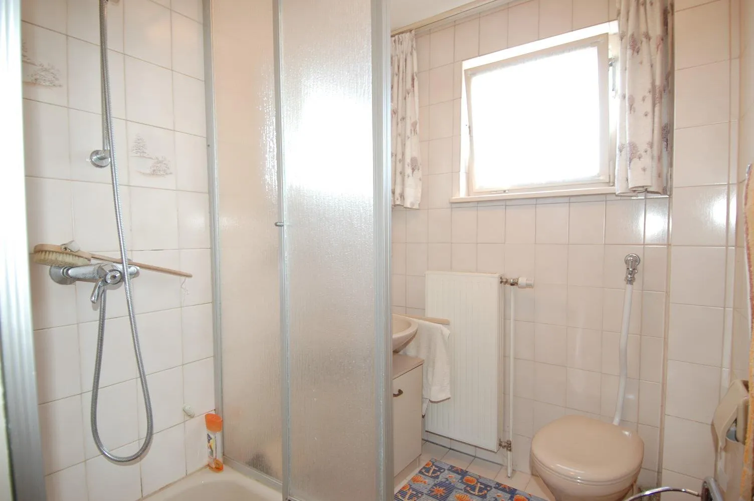 Das Tageslicht-Badezimmer ist raumhoch gefliest und verfügt über eine Dusche, ein Waschbecken und ein WC.