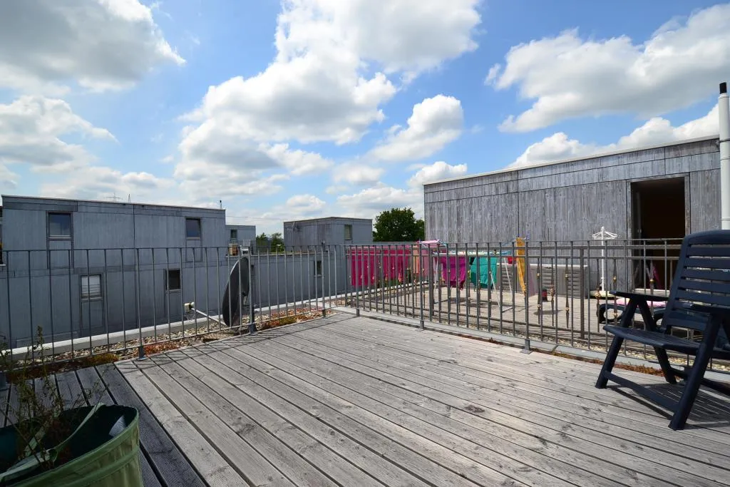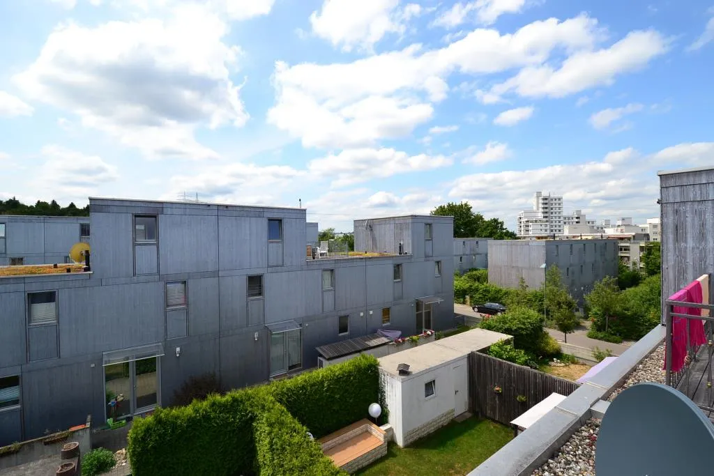 Das Haus wurde in ökologischer Holzrahmen-/Niedrigenergiebauweise, 3-geschossig, mit Vollwärmeschutz und Flachdach mit extensiver Begrünung erstellt.