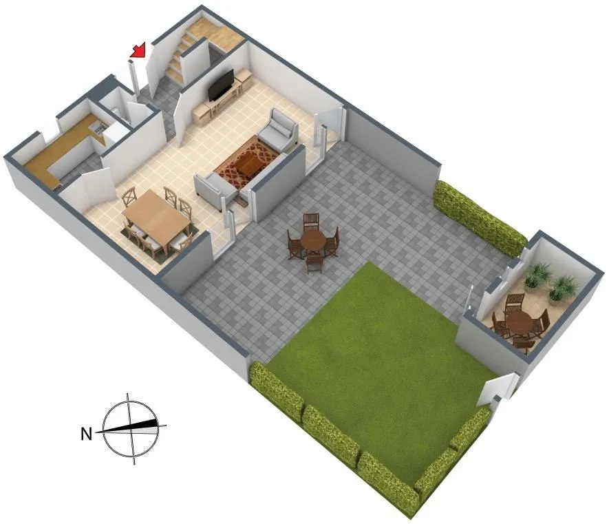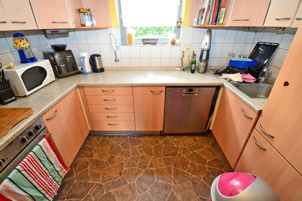 Erdgeschoss: Garderobe, separates WC, Küche mit Einbauküche und Außenabzug, Wohn-/Essbereich und Süd/West-Terrasse mit Garten. Die Terrasse wurde 2010 mit einer Überdachung aus Holz ausgestattet.