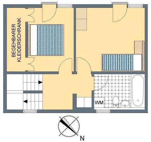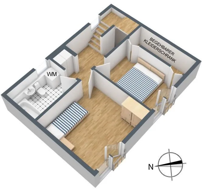 Obergeschoss: Schlafzimmer mit begehbarem Kleiderschrank & französischem Balkon, Kinderzimmer mit französischem Balkon, Tageslichtbad mit Badewanne, Waschbecken, WC und Waschmaschinenanschluss.