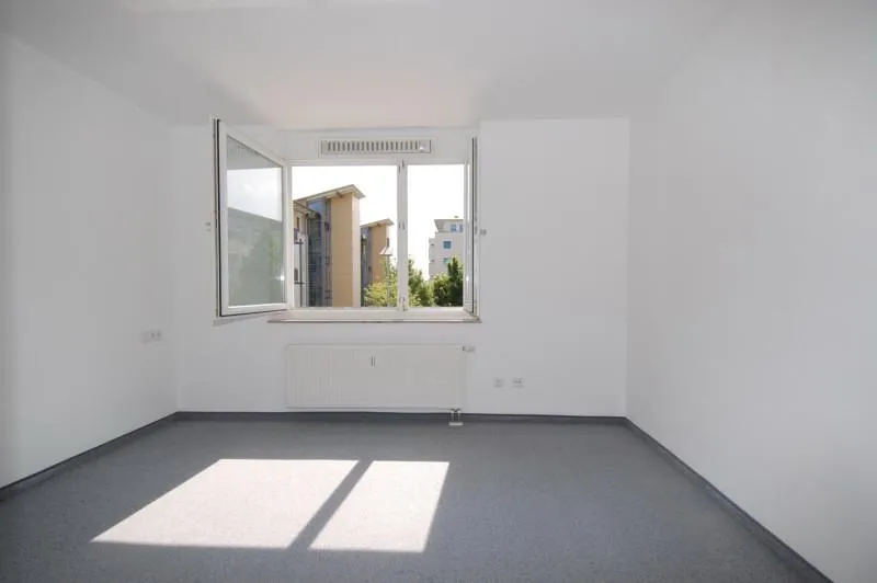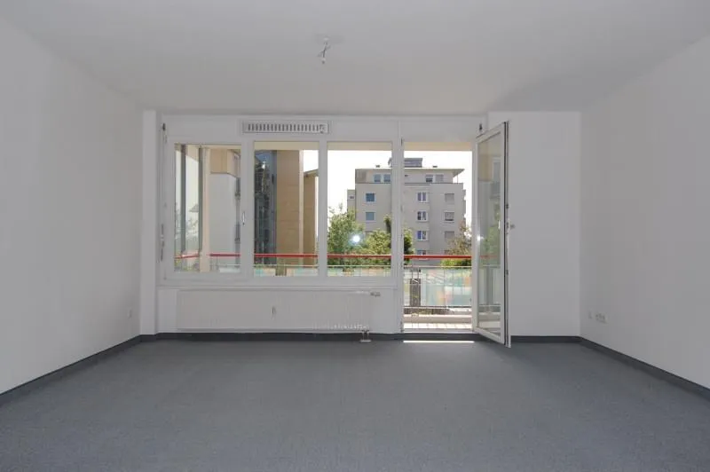 Die Wohnung ist sehr hell. Das Wohnzimmer verfügt zusätzlich an der Nord-Ost Seite über ein bodentiefes Fensterelement mit einem französichen Balkon. Hier können Sie eine Essecke einrichten und haben einen Blick ins Grüne.