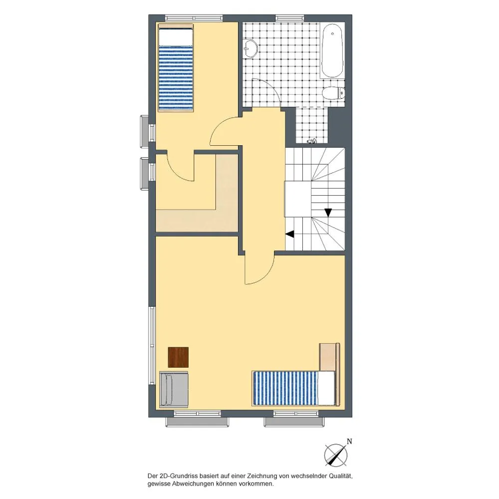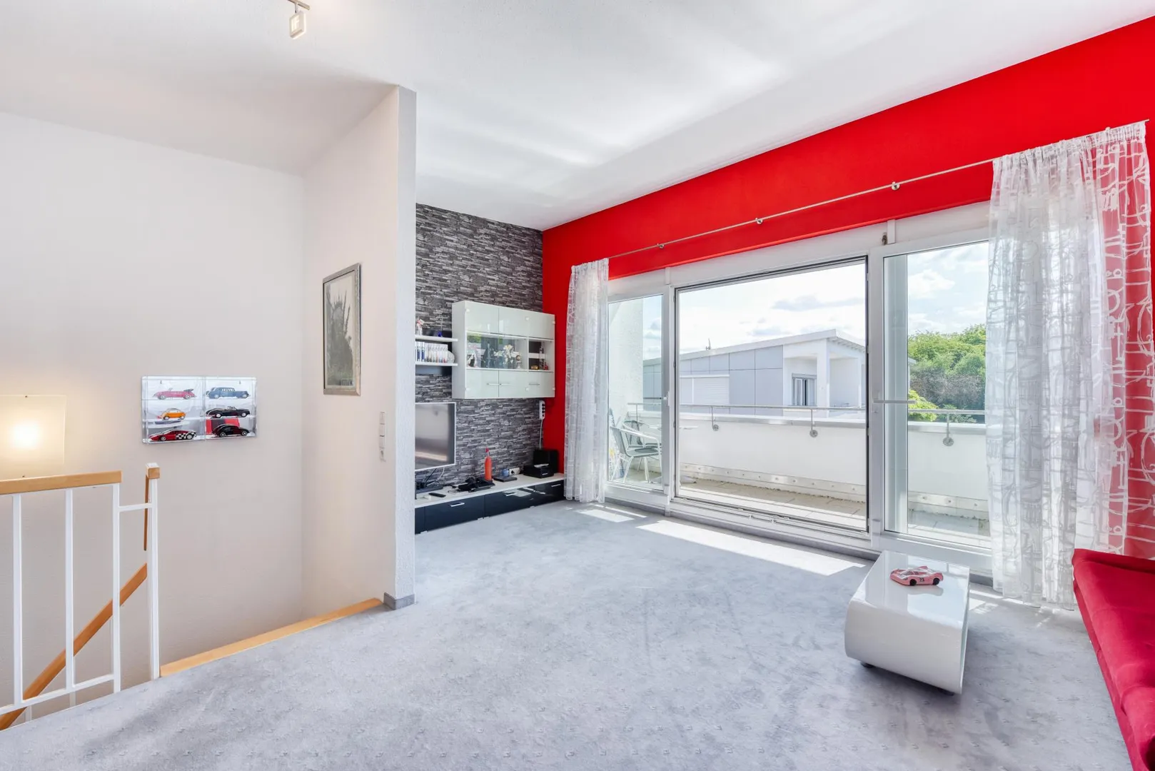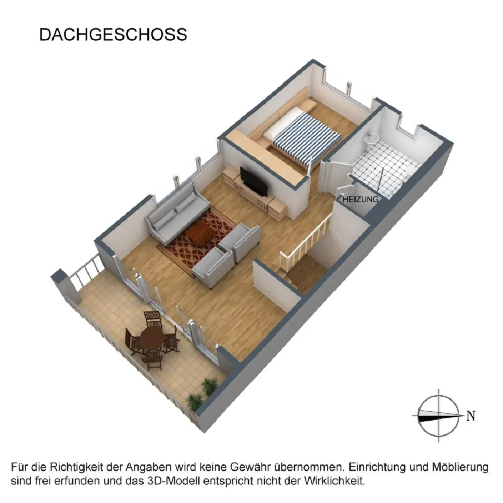 Dachgeschoss (ca. 47 m²): offenes Dach-Studio mit Balkon, Schlafzimmer, Bad (Dusche und WC), ein Raum für die Gas-Brennwerttherme.