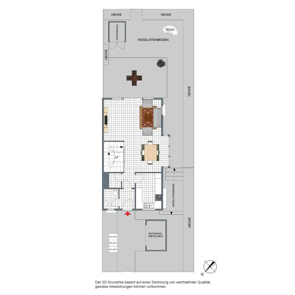 Auf der Nord/West-Hausseite (Straßenseite) befindet sich der Hauseingang mit einem Vorgartenbereich mit einer Zweirad-Garage und Müllbox für 3 Mülltonnen.