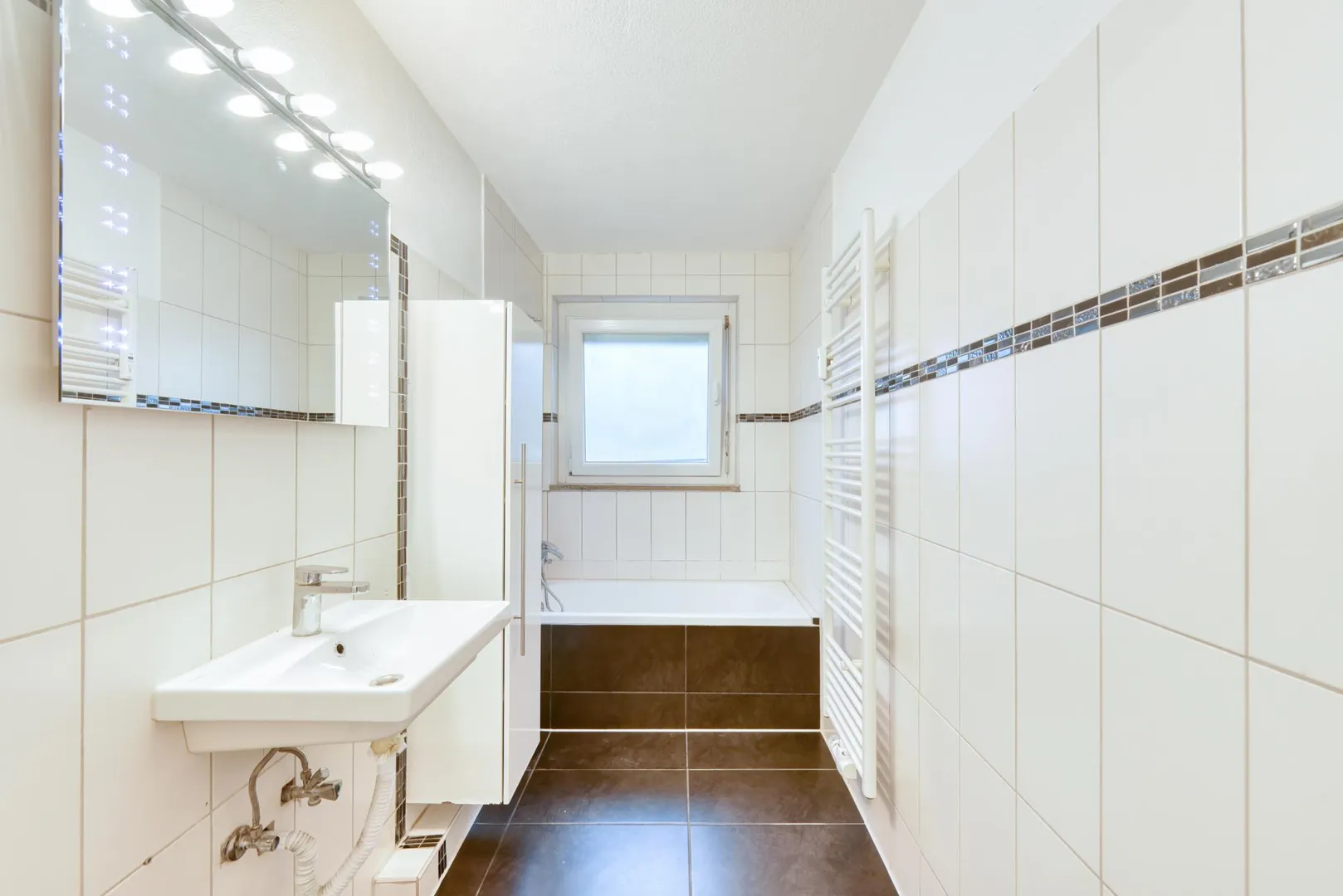 Das Tageslicht-Bad wurde 2009 modernisiert. Es ist teilweise raumhoch und teilweise 2/3-hoch gefliest und ist ausgestattet mit einer Badewanne, einem Fliesenboden, einem Handtuch-Heizkörper, einem belichteten Spiegel sowie einem Waschmaschinen-Anschluss.
