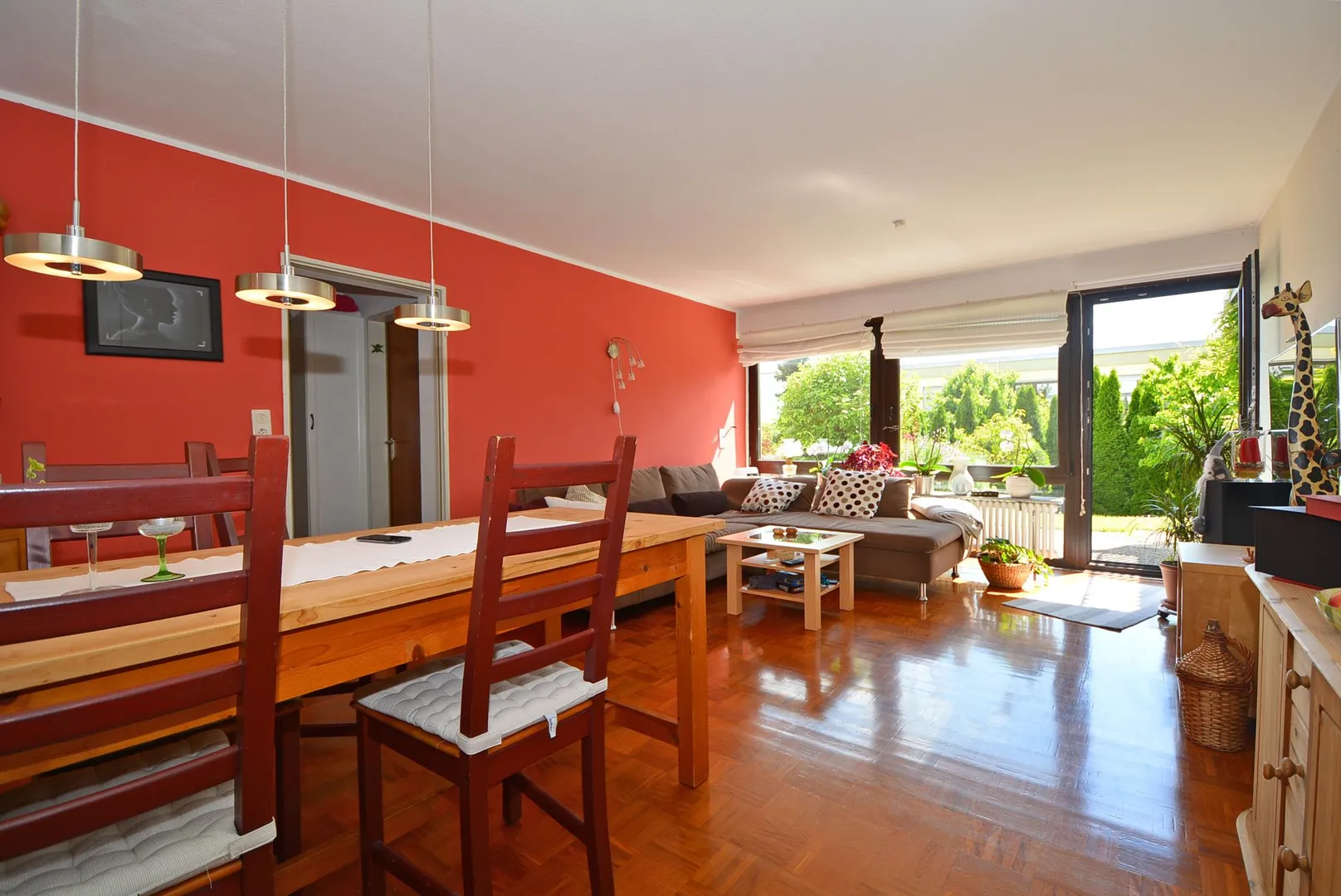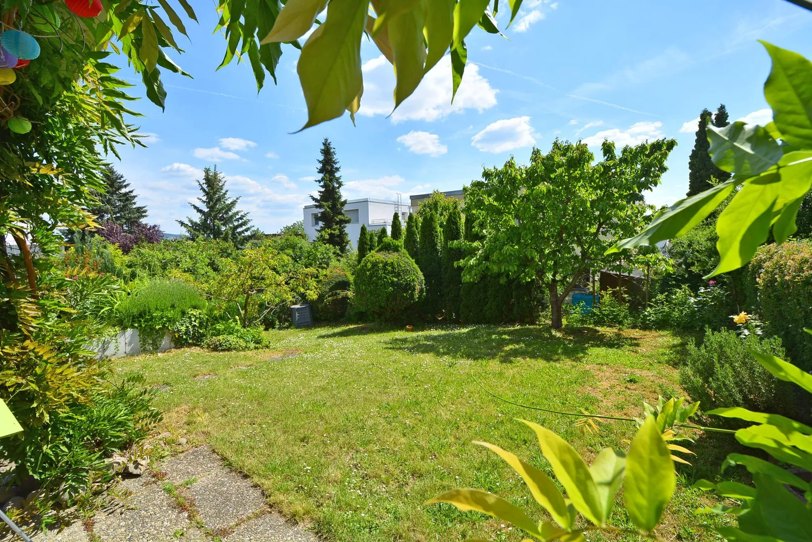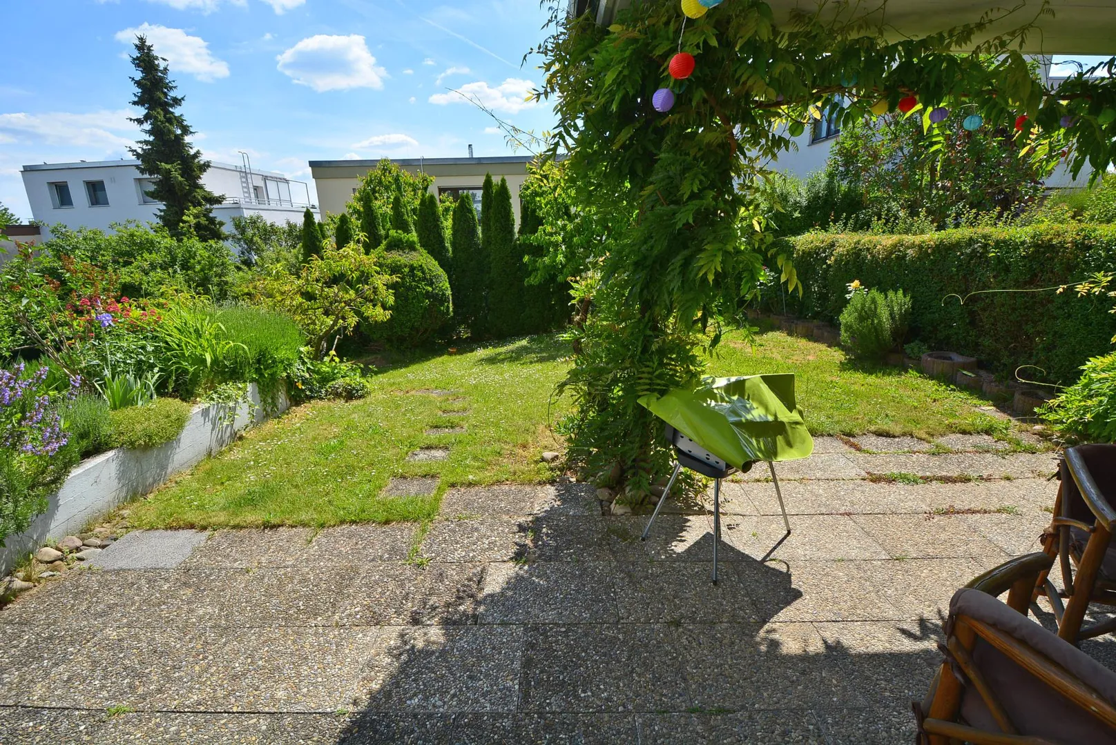 Zur Wohnung gehört ein großzügiger und idyllischer Garten mit Obstbäumen (Kirsche und Pfirsich). Die ca. 25 m² große und teilüberdachte Süd-Terrasse ist vom Wohnzimmer sowie vom Schlafzimmer begehbar.