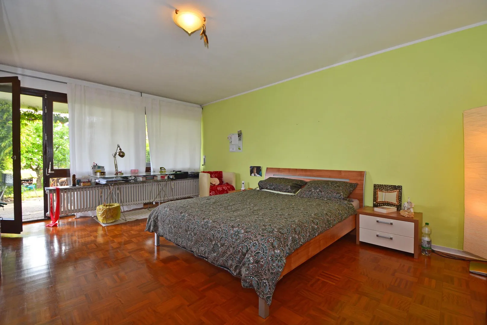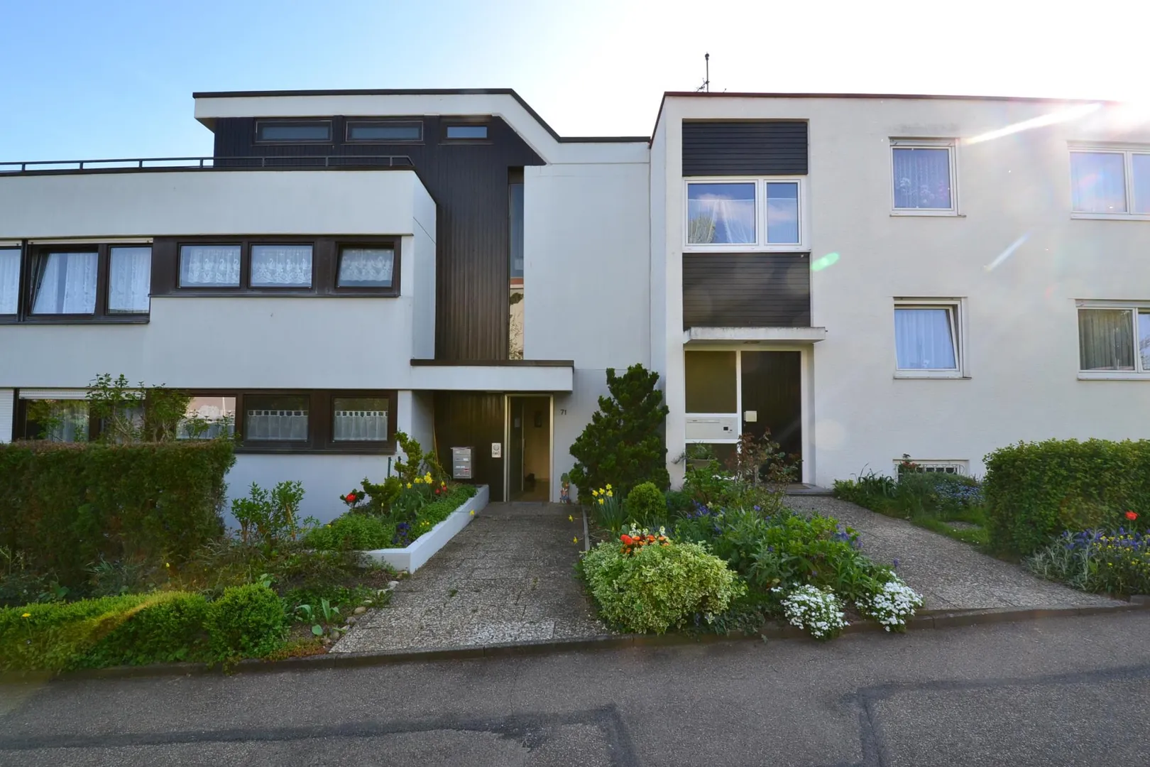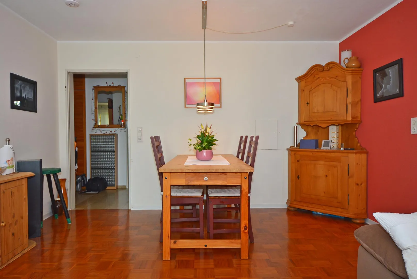 Zur Wohnung gehört ein großzügiger und idyllischer Garten mit Obstbäumen (Kirsche und Pfirsich). Die ca. 25 m² große und teilüberdachte Süd-Terrasse ist vom Wohnzimmer sowie vom Schlafzimmer begehbar.