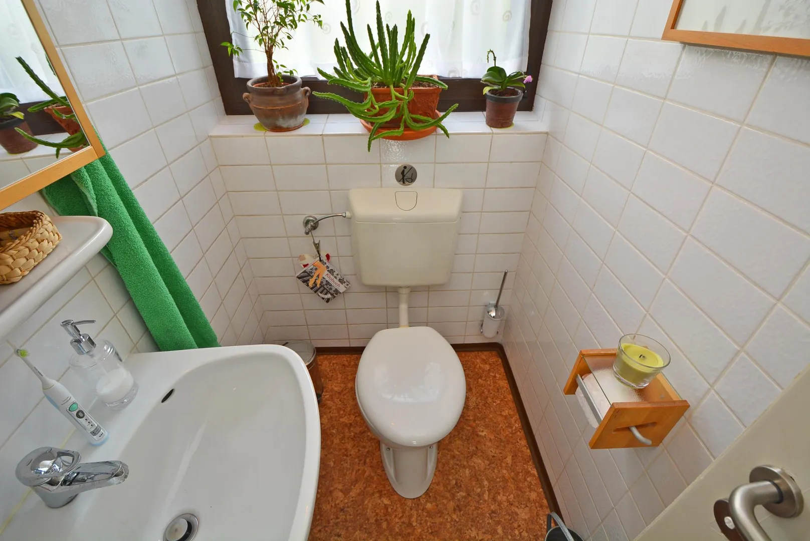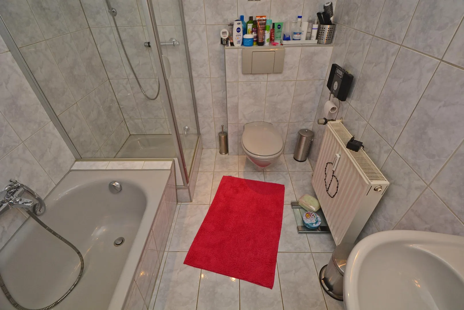 Das raumhoch geflieste Badezimmer ist mit einer Badewanne, einer Dusche einem Waschbecken, einem WC sowie einer abgehängter Decke mit Halogenstrahlern ausgestattet. Das Gäste-WC ist mit einem Fenster ausgestattet.