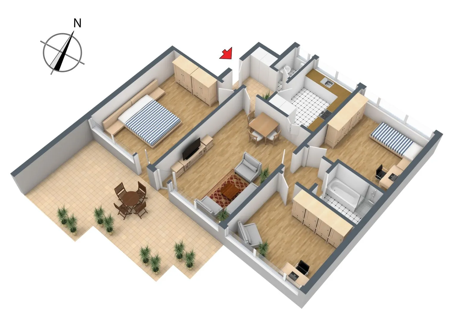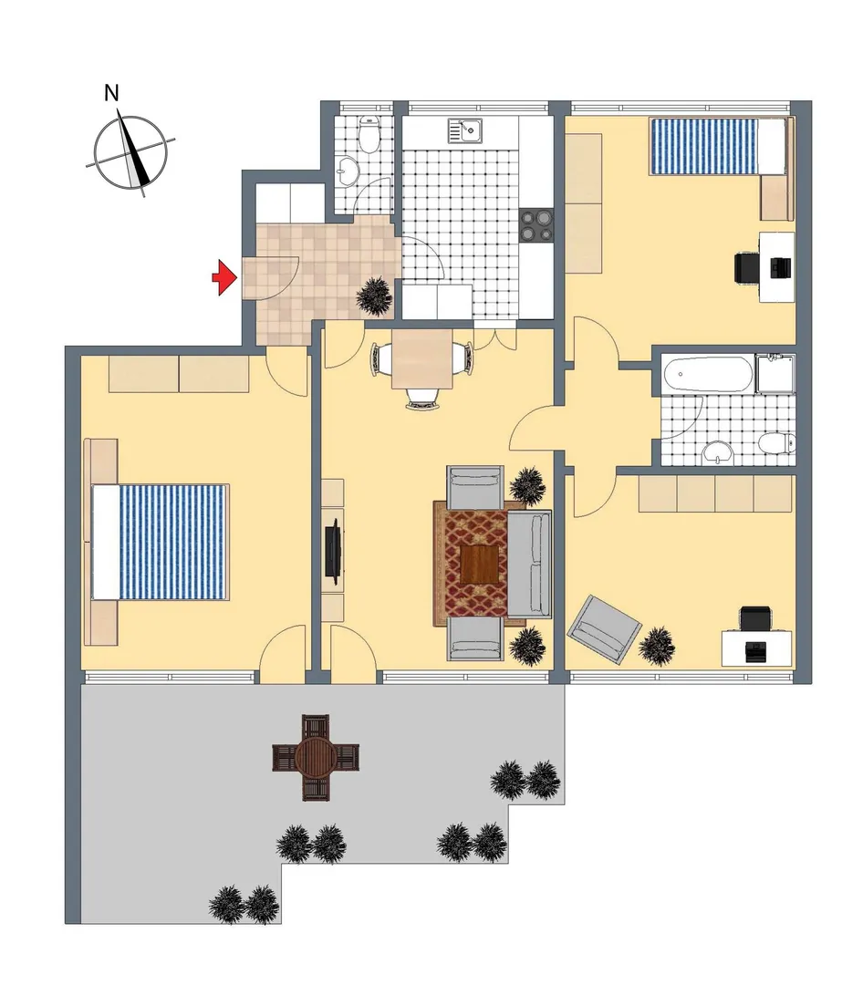 Das Wohnzimmer, das Schlafzimmer sowie das Arbeitszimmer sind nach Süden ausgerichtet. Das Kinderzimmer sowie die Küche sind nach Norden ausgerichtet.
