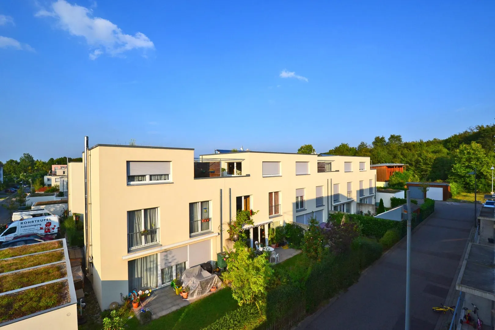 Das Haus mit ca. 124 m² Wohnfläche verfügt über 5 Zimmer, eine offene Küche, ein Tageslichtbad, ein separates WC, einen Abstellraum, eine Süd/West-Terrasse mit Garten und eine nach Nord/Westen ausgerichtete Dachterrasse. Die Nutzfläche im Untergeschoss beträgt ca. 45 m².