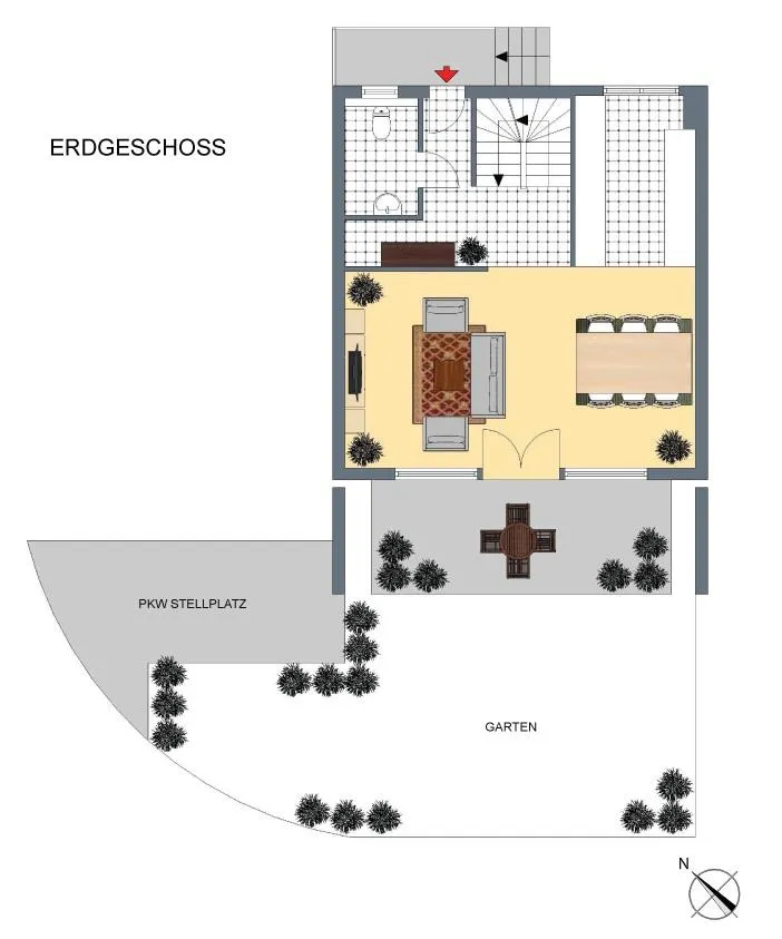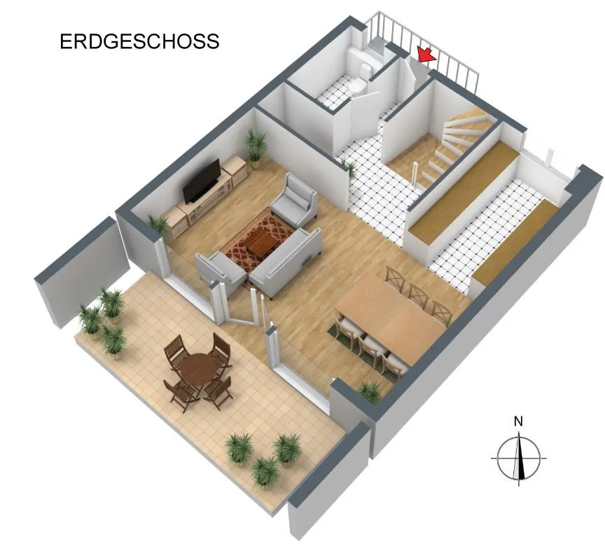 Erdgeschoss: eine Garderobe, ein separates WC mit Fenster, eine offene Küche mit Einbauküche und Außenabzug, ein Wohn-/Essbereich sowie eine Süd/West-Terrasse mit Garten.