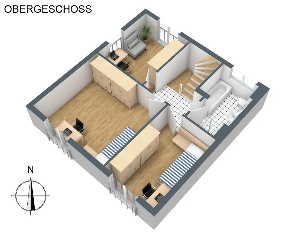 Obergeschoss: zwei Kinderzimmer und ein Arbeitszimmer mit französischen Balkonen, ein raumhoch gefliestes Tageslichtbadezimmer mit einer Badewanne, einer Dusche sowie einem WC.