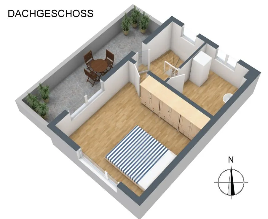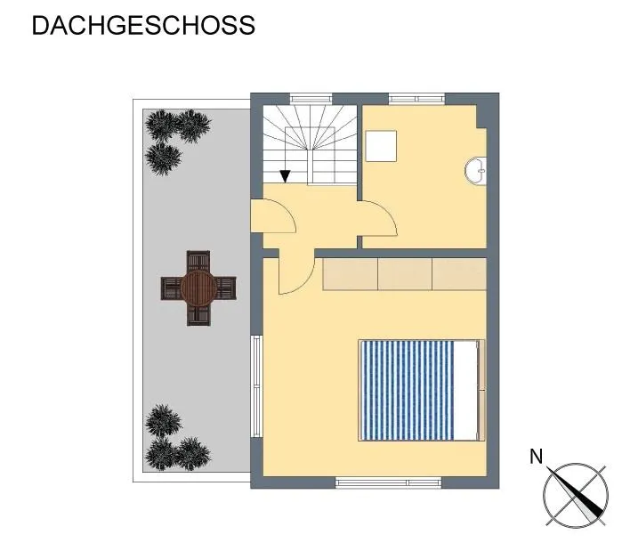 Dachgeschoss: ein Schlafzimmer, ein Abstellraum mit Fenster, Waschbecken, Heiztherme und Anschlüsse für ein zweites Badezimmer sowie eine nach Nord/Westen ausgerichtete Dachterrasse mit Fernblick.